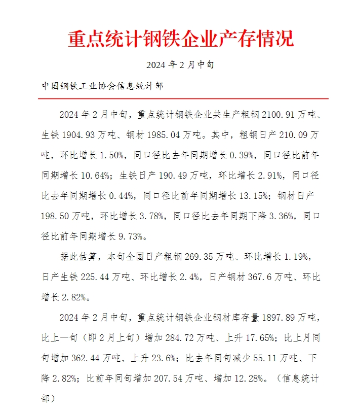 中钢协:2024年2月中旬,重点统计钢铁企业共生产粗钢 2100.91 万吨生铁 1904.93万吨、钢材 1985.04 万吨。其中,粗钢日产210.09万吨,环比增长1.50%,同口径比去年同期增长 0.39%,同口径比前年同期增长10.64%; 生铁日产190.49 万吨,环比增长 2.91%,同口径比去年同期增长 0.44%,同口径比前年同期增长 13.15%; 钢材日产198.50 万吨,环比增长 3.78%,同口径比去年同期下降 3.36%,同口径比前年同期增长9.73%。