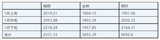 中国钢铁工业协会统计数据显示,重点统计钢铁企业2024年1月上旬共生产粗钢2019.21万吨、生铁1804.15万吨、钢材1901.96万吨;1月中旬共生产粗钢2093.88万吨、生铁1893.39万吨、钢材2026.33万吨;1月下旬共生产粗钢2218.24万吨、生铁1957.85万吨、钢材2164.31万吨。根据以上数据,中钢协重点统计钢铁企业1月粗钢产量累计6331.33万吨,生铁产量5655.39万吨,钢材产量6092.6万吨。重点统计钢铁企业产量如下: