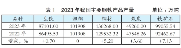2023年我国钢铁工业实行限制产量,主要钢铁产品产量见表1。2023年中国钢铁工业协会重点统计钢铁企业(以下简称会员单位)的铁、钢产量分别为74776.69万吨、82514.19万吨,同比分别上升2.86%、4.27%;其他钢铁企业的铁、钢产量分别为12324.31万吨、19393.81万吨,同比分别下降16.64%、10.58%,其下降幅度均高于会员单位产量变化幅度,使我国钢铁产业集中度进一步升高,有利于我国钢铁工业结构优化、能耗降低、冶金设备大型化发展。