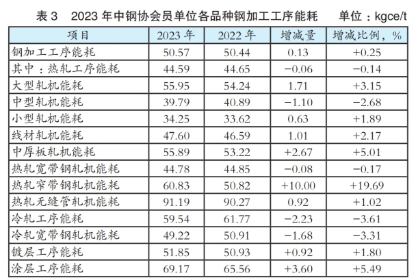 2023年中钢协会员单位各品种钢加工工序能耗见表3。从表3可以看出,2023年热轧工序能耗、冷轧工序能耗同比呈现不同幅度的下降。其中,中型、热轧宽带钢、冷轧宽带钢3个品种的轧机能耗同比降低,表明节能水平提高。