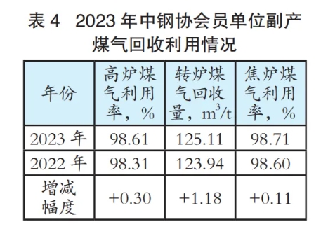 5)2023年会员单位转炉煤气回收水平提高、高炉煤气和焦炉煤气利用率提高(表4),有利于企业综合节能。