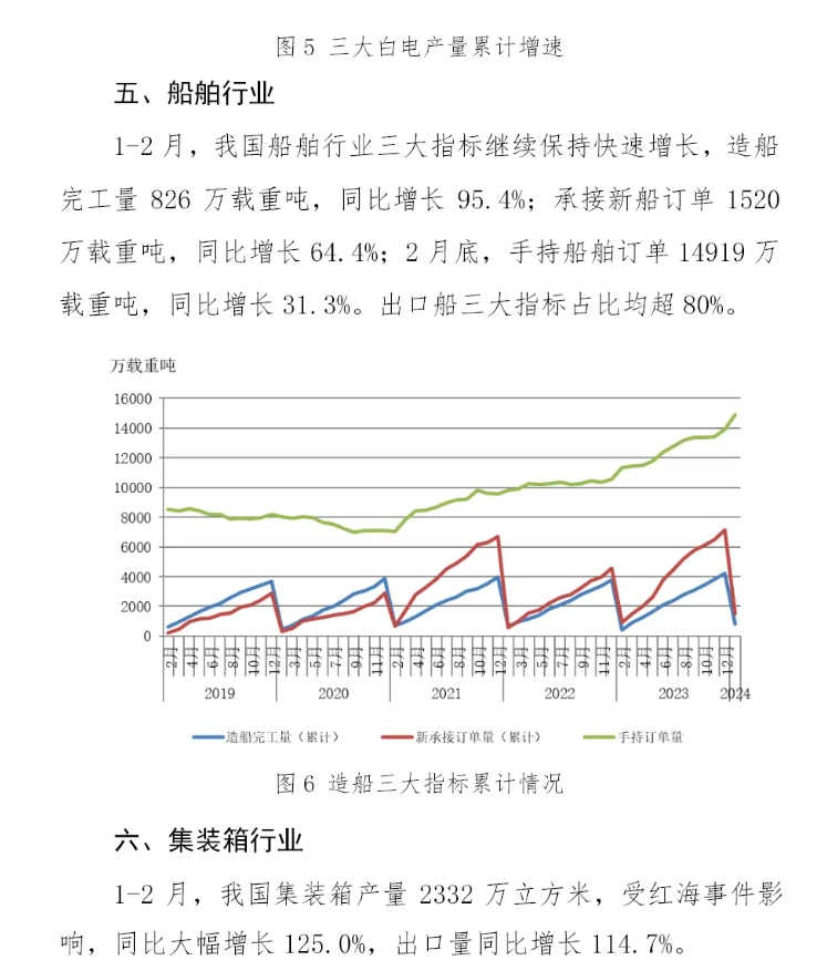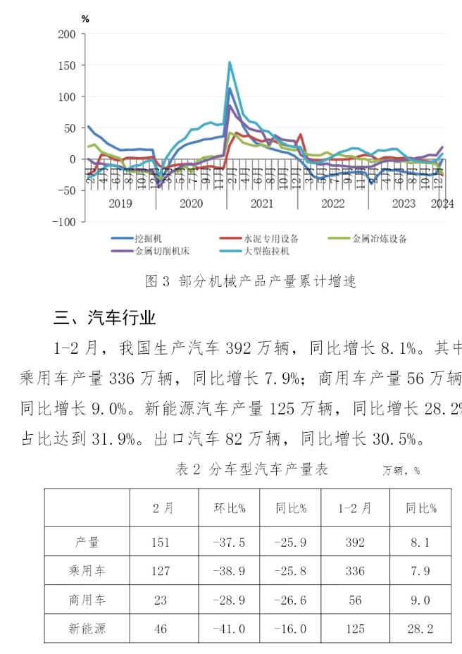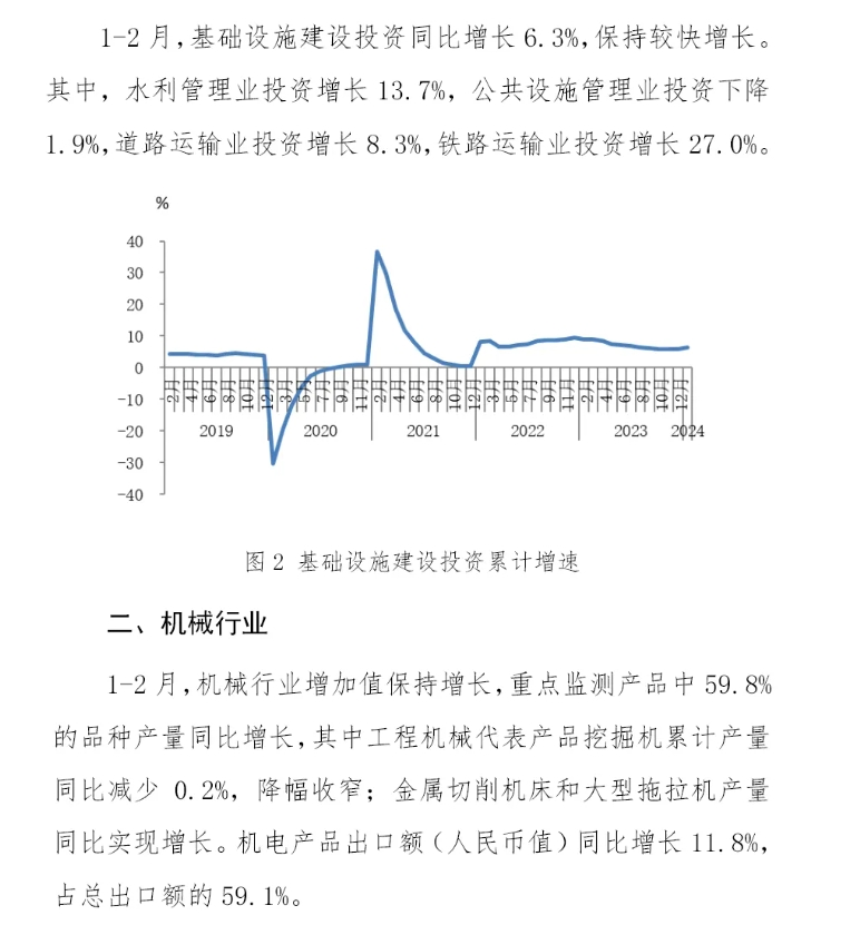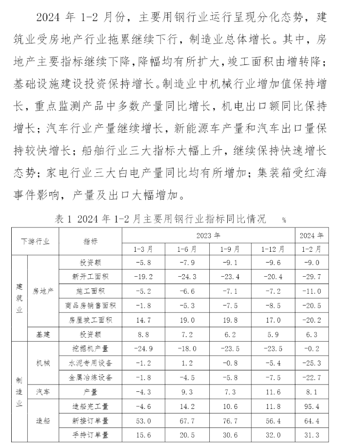 2024年1-2月份,主要用钢行业运行呈现分化态势,建筑业受房地产行业拖累继续下行,制造业总体增长。其中,房地产主要指标继续下降,降幅均有所扩大,竣工面积由增转降;基础设施建设投资保持增长。