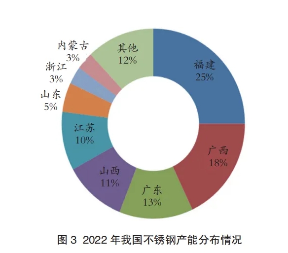 从20世纪90年以来,福建、广西、江苏、广东、浙江等地,生产不锈钢产品的民营企业逐步兴起。目前我国不锈钢的产业园区已达20余家;多个不锈钢产业加工园区,加工能力有的已达千万吨以上的规模。图3是2022年我国主要不锈钢产能分布情况。从我国不锈钢企业的分布来看,主要企业分布在华东和华南地区。