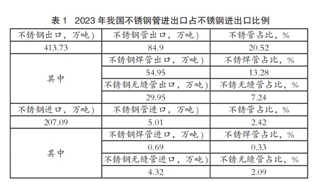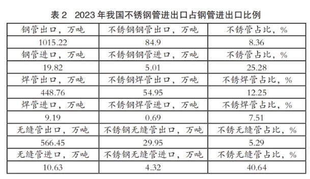2023年不锈钢管进出口占不锈钢进出口比例情况见表1;2023年不锈钢管进出口占钢管进出口比例见表2。