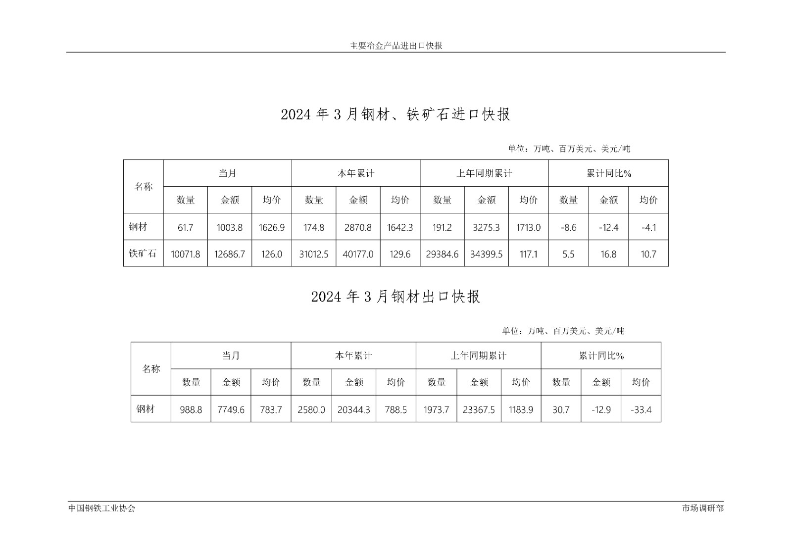 根据海关统计快讯数据,2024年3月,我国进口钢材61.7万吨,环比增加9.1万吨,增长17.4%;均价1626.9美元/吨环比减少 58.9美元/吨,下降3.5%。1-3月累计进口钢材174.8万吨,同比减少 16.4万吨,下降8.6%。