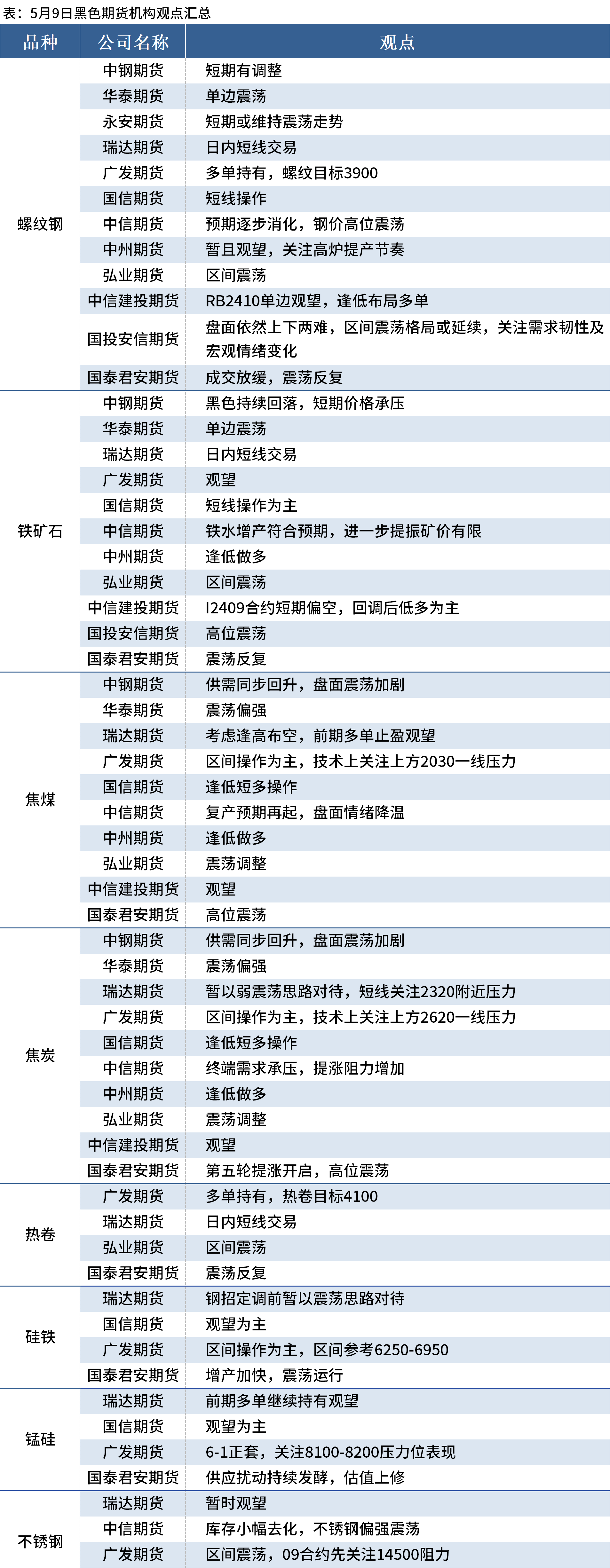 据Mysteel统计5月9日12家期货机构操作策略,其中多数机构料螺纹钢震荡运行,铁矿石震荡运行,焦煤、焦炭震荡运行。具体汇总内容如下: