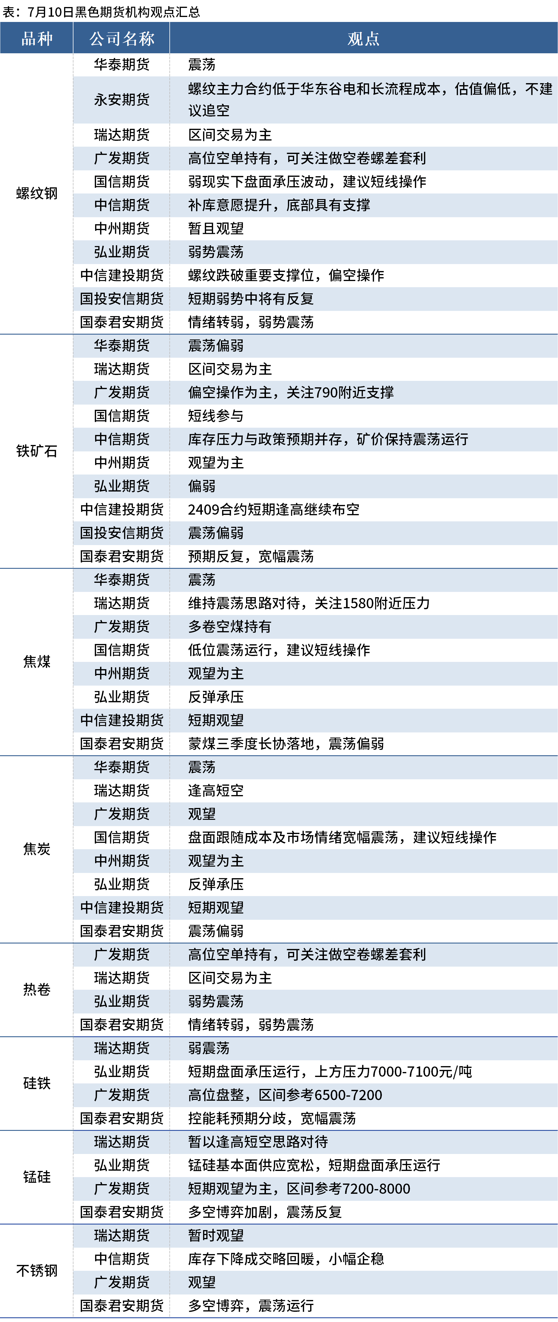 据Mysteel统计7月10日11家期货机构操作策略,其中多数机构料螺纹钢弱势震荡,铁矿石震荡偏弱,焦煤、焦炭震荡运行。具体汇总内容如下: