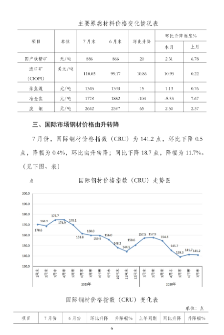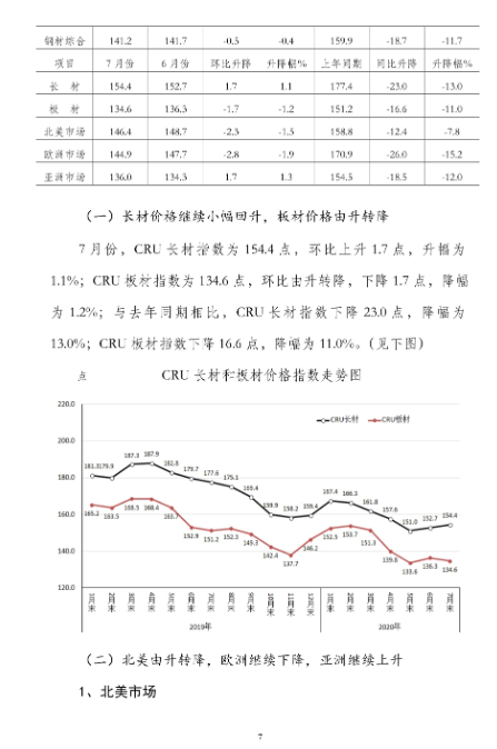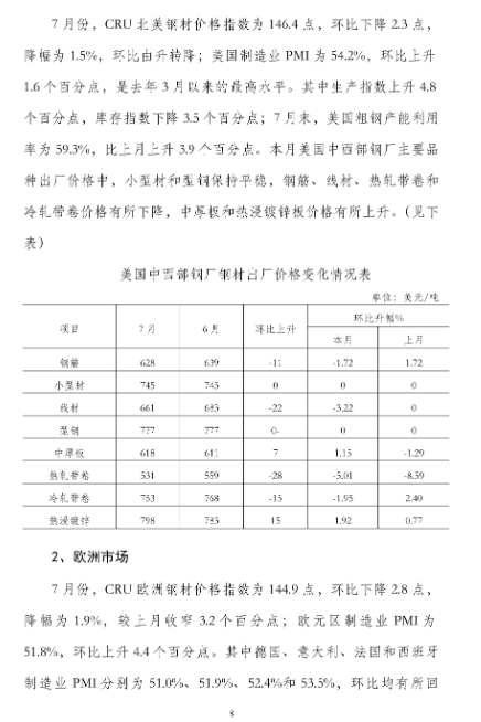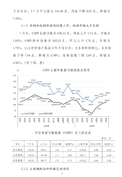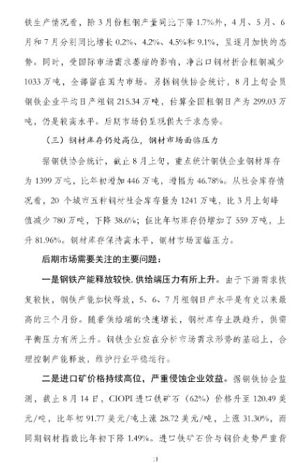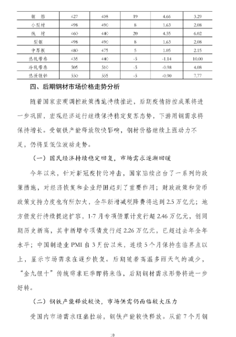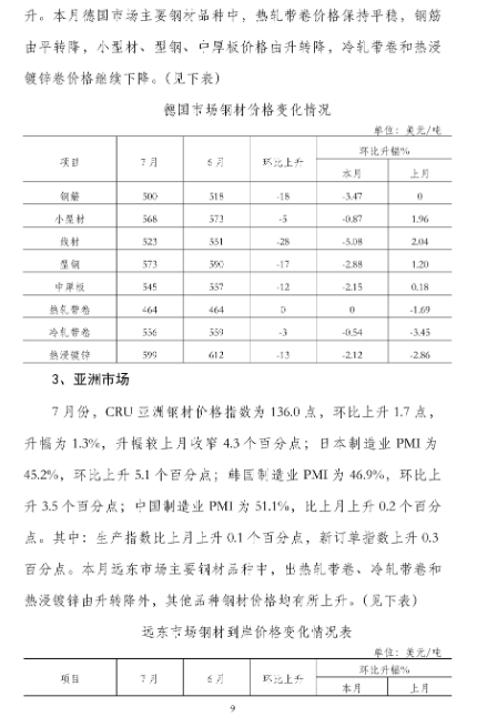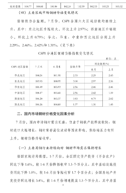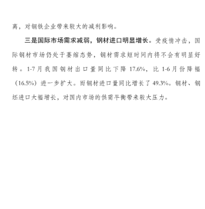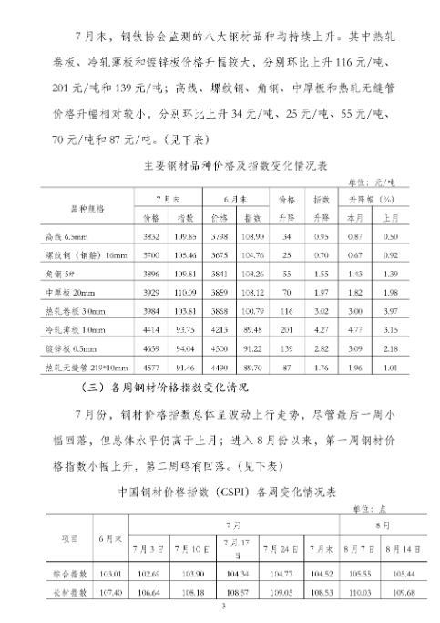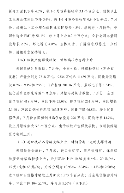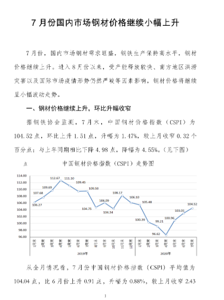 7月份,国内市场钢材需求旺盛,钢铁生产保持高水平,钢材价格继续上升。进入8月份以来,受产能释放较快,南方地区洪涝灾害以及国际市场疫情形势仍然严峻等因素影响,钢材价格将继续呈现小幅波动走势。