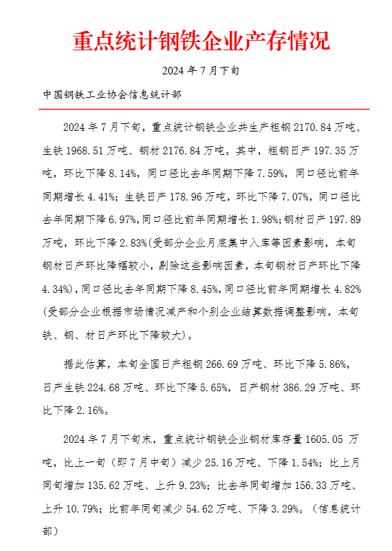 2024年7月下旬,重点统计钢铁企业共生产粗钢2170.84万吨、生铁1968.51万吨、钢材2176.84万吨。其中,粗钢日产197.35万吨,环比下降8.14%,同口径比去年同期下降7.59%,同口径比前年同期增长4.41%;生铁日产178.96万吨,环比下降7.07%,同口径比去年同期下降6.97%,同口径比前年同期增长1.98%;钢材日产197.89万吨,环比下降2.83%(受部分企业月底集中入库等因素影响,本旬钢材日产环比降幅较小,剔除这些影响因素,本旬钢材日产环比下降4. 34%),同口径比去年同期下降 8.45%,同口径比前年同期增长4.82%(受部分企业根据市场情况减产和个别企业结算数据调整影响,本旬铁、钢、材日产环比下降较大)。