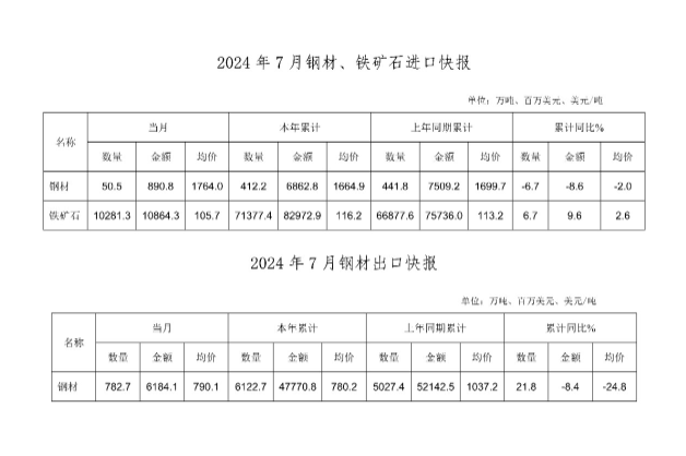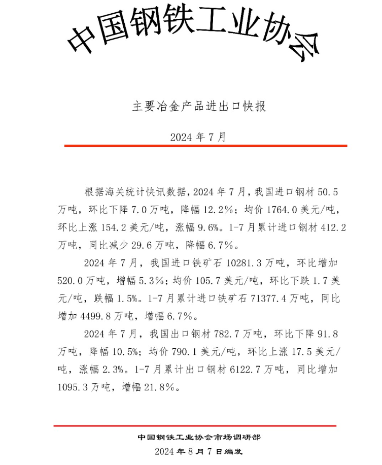 2024年7月钢铁产品进出口快报