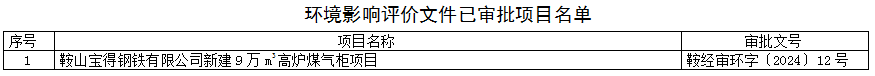 根据建设项目环境影响评价审批程序有关规定,经审查,我办对鞍山宝得钢铁有限公司新建9万m3高炉煤气柜项目环境影响评价文件做出审批决定,现将决定予以公告。