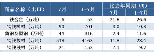 7月,中国出口钢铁棒材90万吨,同比增长3.0%;1-7月累计出口701万吨,同比增长10.3%。其他出口情况如下表所示:
