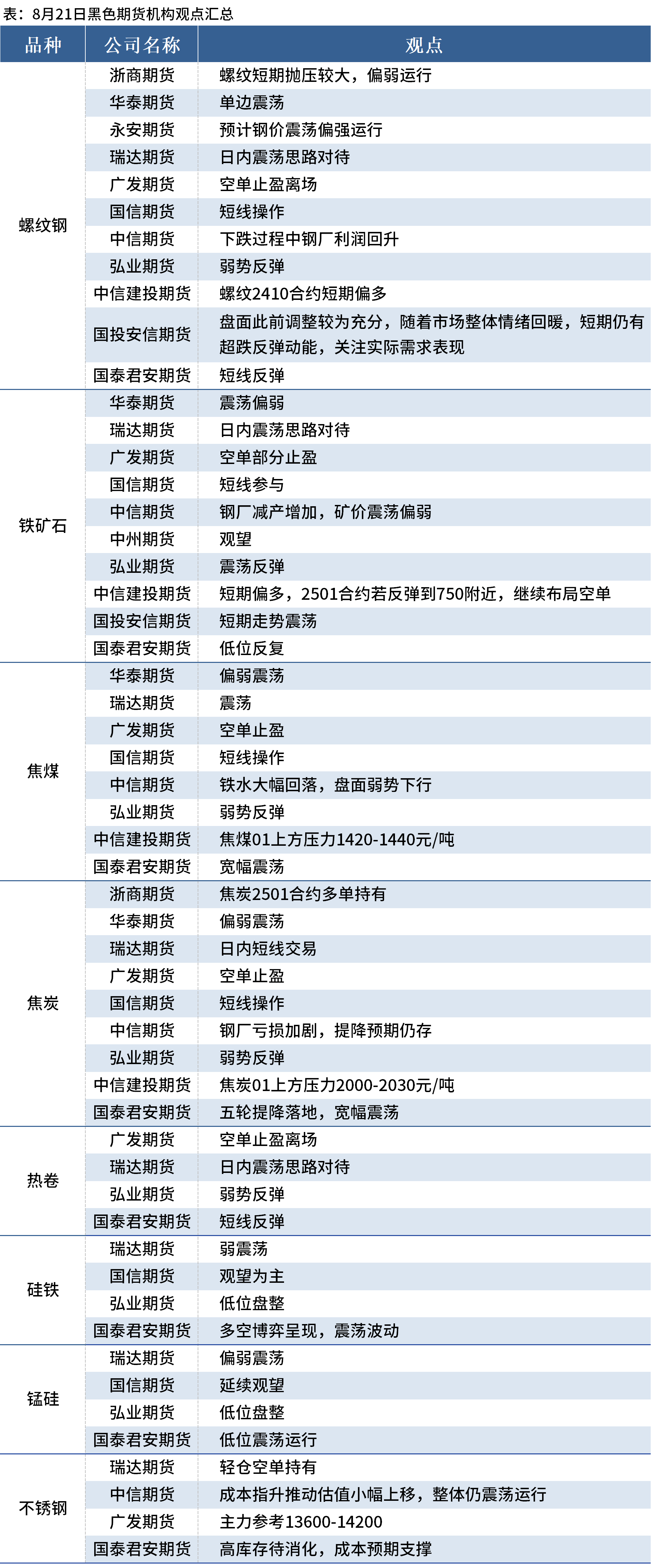据Mysteel统计8月21日12家期货机构操作策略,其中多数机构料螺纹钢震荡运行,铁矿石震荡运行,焦煤、焦炭弱势震荡。具体汇总内容如下: