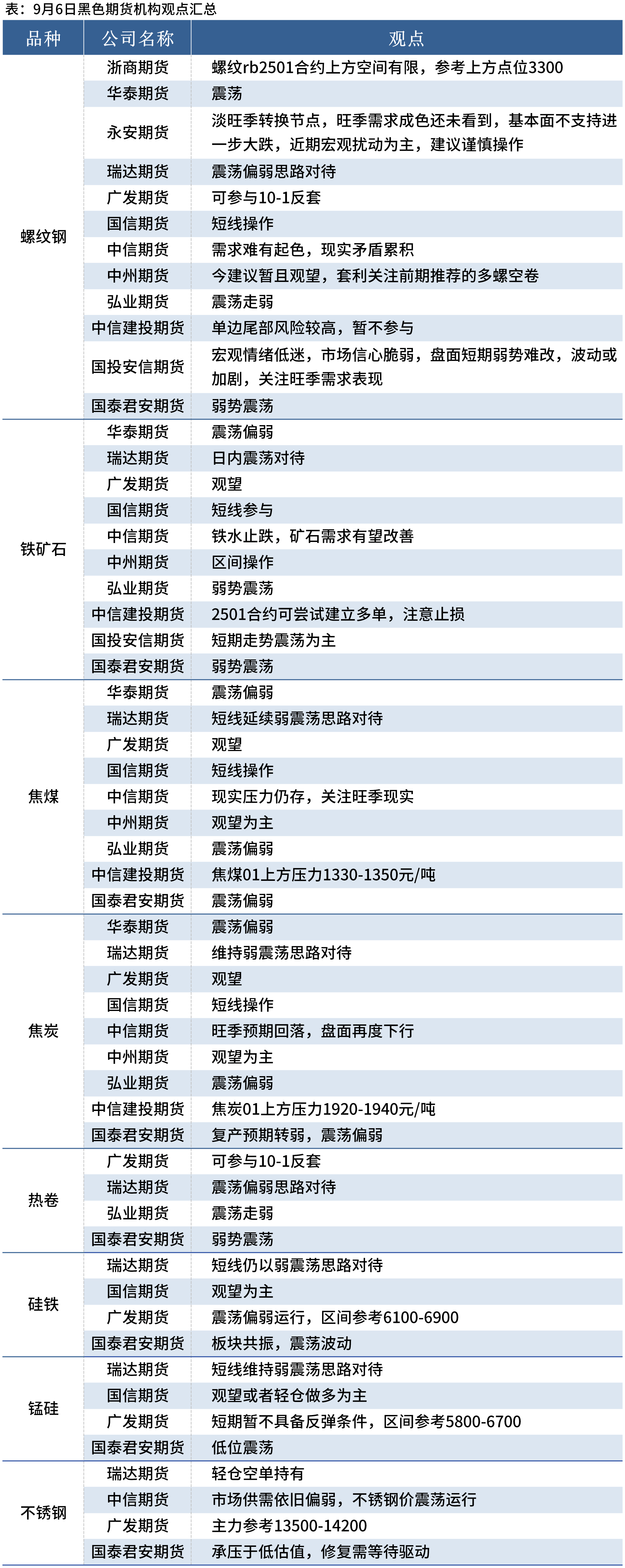 据Mysteel统计9月6日12家期货机构操作策略,其中多数机构料螺纹钢震荡偏弱,铁矿石弱势震荡,焦煤、焦炭震荡偏弱。具体汇总内容如下: