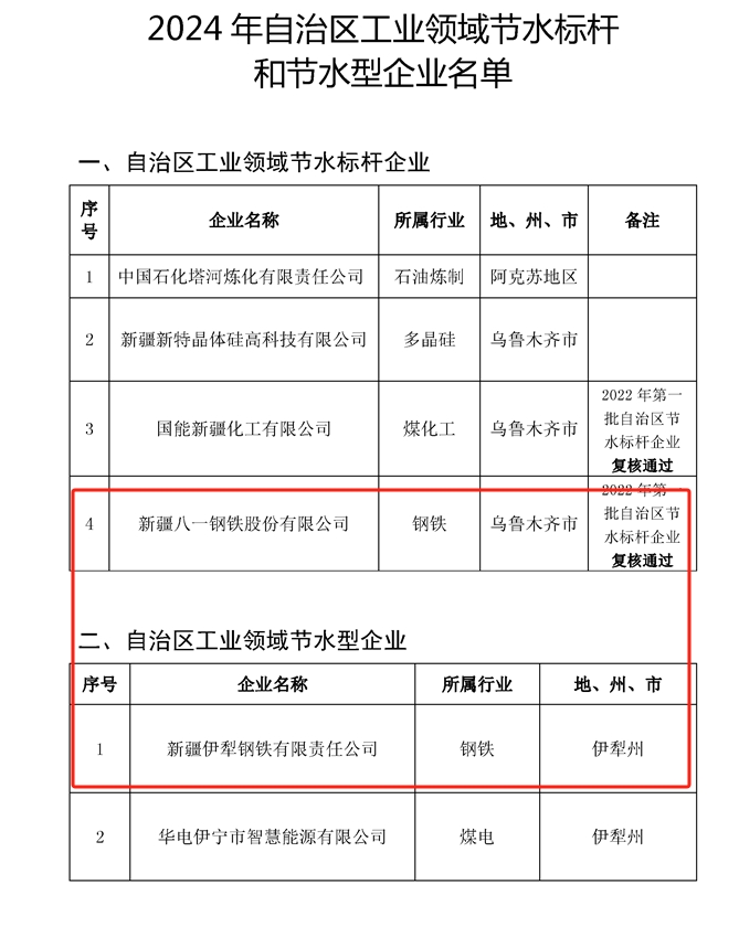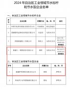 为贯彻落实国家工业和信息化部、水利部、发展改革委、市场监管总局等4部委联合印发的《关于组织开展2024年重点用水企业、园区水效领跑者遴选工作的通知》(工信厅联节〔2024〕225号)要求,我厅组织开展了2024年自治区工业领域节水标杆和节水型企业创建工作。经企业自愿申报,逐级审核、现场核查和推荐,并联合自治区水利厅、发展改革委、市场监督管理局等单位组织专家复审等程序,现将拟定为2024年自治区工业领域节水标杆和节水型企业名单进行公示(见附件)。如有异议,请在自公示之日起5个工作日内以书面形式将意见反馈至自治区工信厅节能处或自治区水利厅节水办。