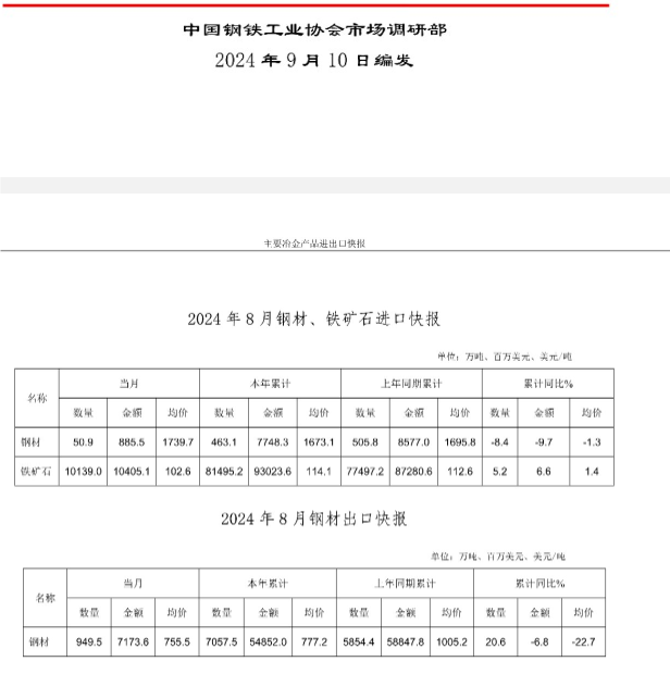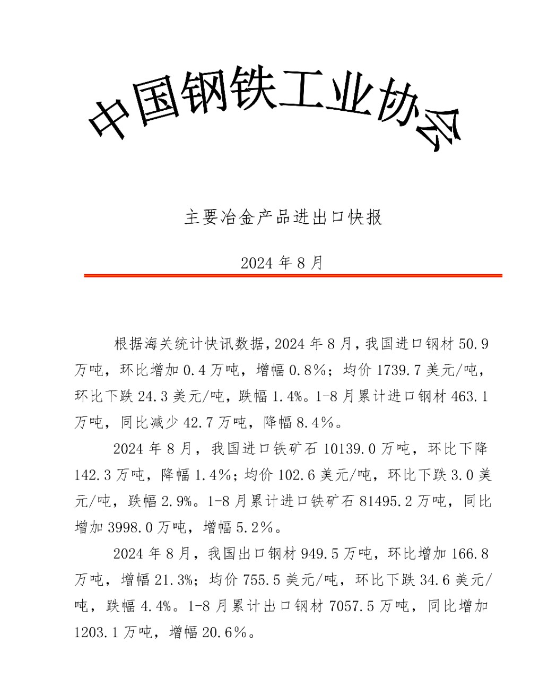 2024年8月钢铁产品进出口快报