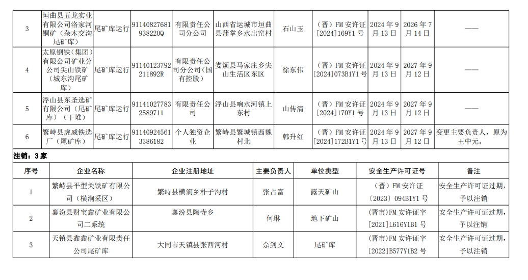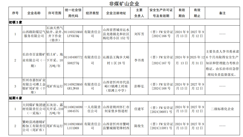 对长治市百富勤矿业有限公司(一期)等3 家非煤矿山企业予以颁发安全生产许可证。对大同煤矿集团建材有限责任公司(一采场)等 6 家非煤矿山企业安全生产许可证予以延期。对繁峙县平型关铁矿有限公司(横涧采区)等3 家非煤矿山企业安全生产许可证予以注销。