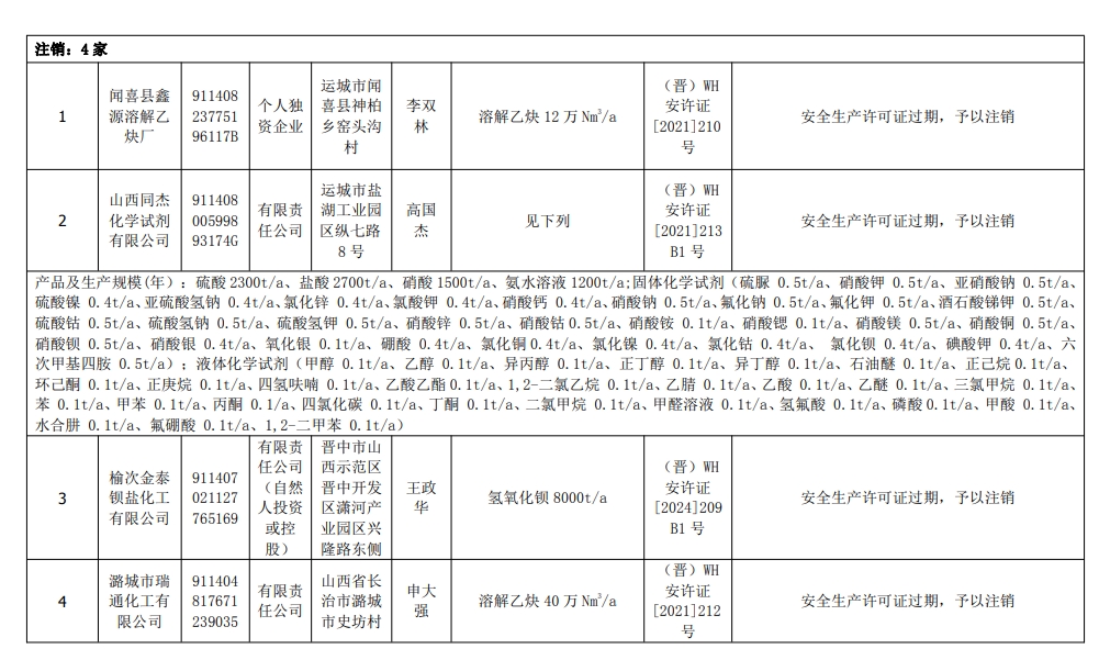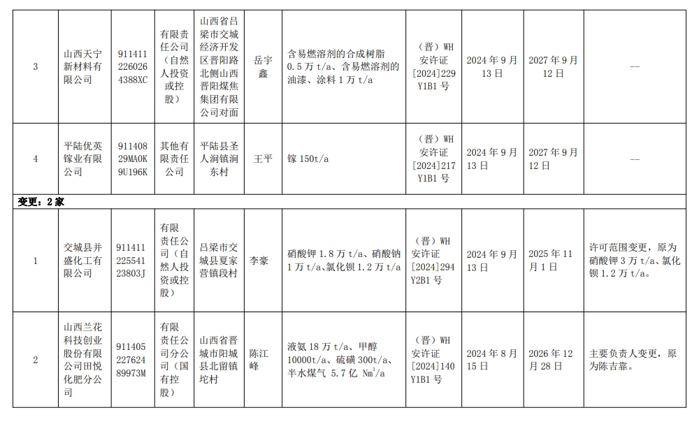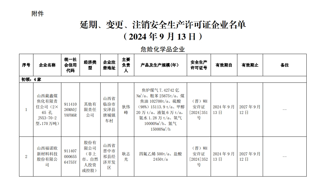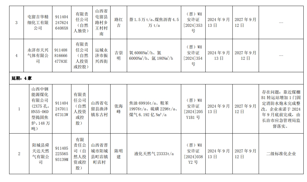 对山西蔺鑫煤焦化有限责任公司(2×65 孔JNX3-70-2型,170 万吨)等 4 家危险化学品生产企业予以颁发安全生产许可证。对山西中钢能源煤化有限公司(2X75 孔,HN55-06D 型捣固焦炉,148 万吨)等 4 家危险化学品生产企业安全生产许可证予以延期。对交城县并盛化工有限公司等 2 家危险化学品生产企业安全生产许可证予以变更。对闻喜县鑫源溶解乙炔厂等4 家危险化学品生产企业安全生产许可证予以注销。