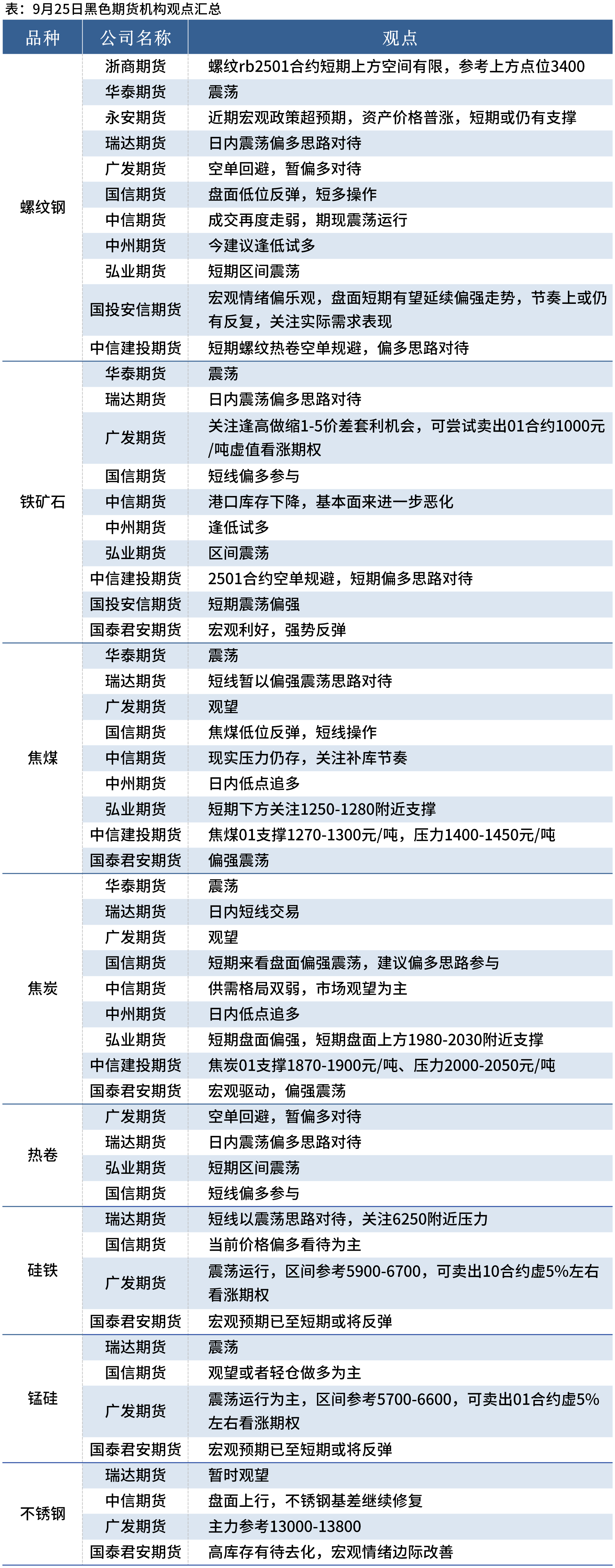 据Mysteel统计9月25日12家期货机构操作策略,其中多数机构料螺纹钢震荡偏多,铁矿石震荡偏强,焦煤、焦炭偏强震荡。具体汇总内容如下: