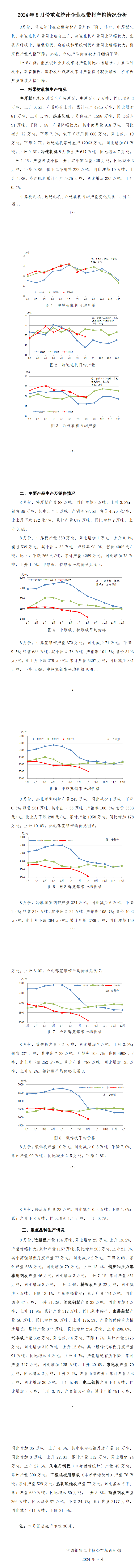 8月份,重点统计企业板带材产量总体下降,其中,中厚板轧机、冷连轧机产量同比略有上升,热连轧机产量同比降幅较大。主要品种板中,集装箱板、造船板和管线钢板产量同比增幅较大;桥梁板产量大幅下降。热轧、冷轧产品价格较上月继续下降。