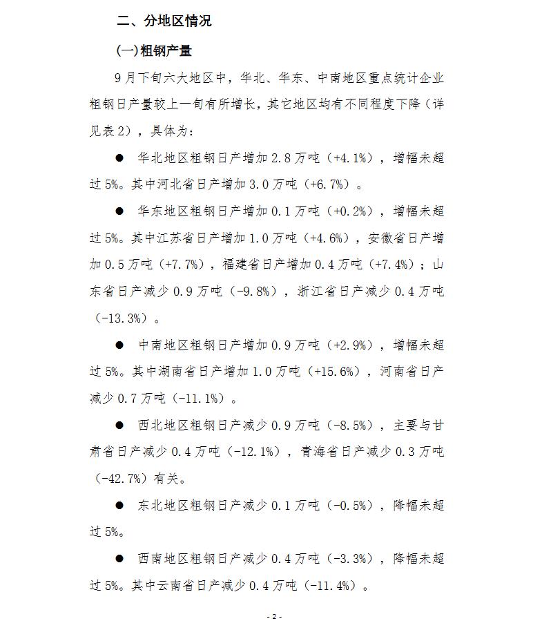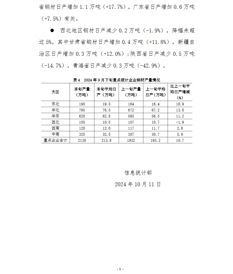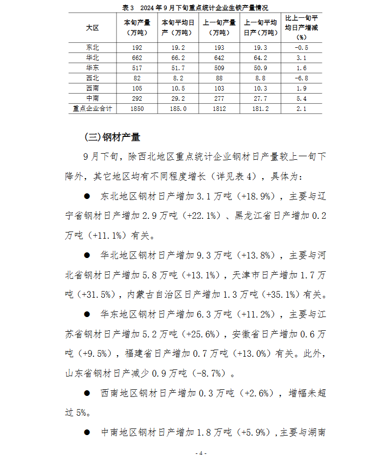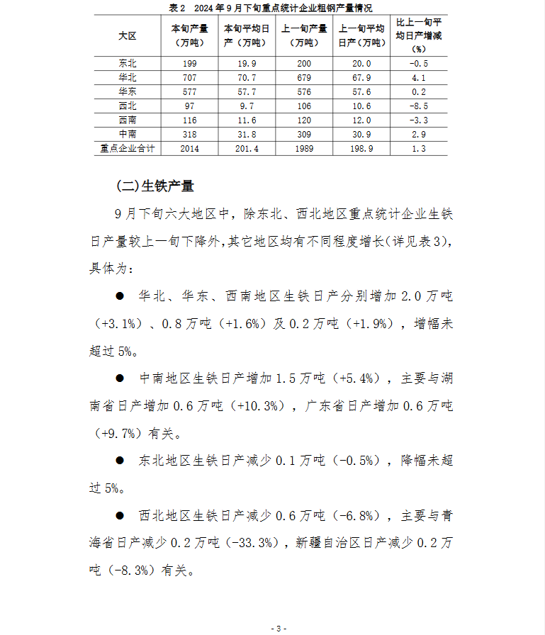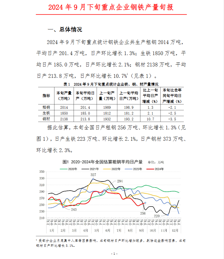 2024年9月下旬重点统计钢铁企业共生产粗钢2014万吨,平均日产201.4万吨,日产环比增长1.3%;生铁1850万吨,平均日产185.0万吨,日产环比增长2.1%;钢材2138万吨,平均日产213.8万吨,日产环比增长10.7%。