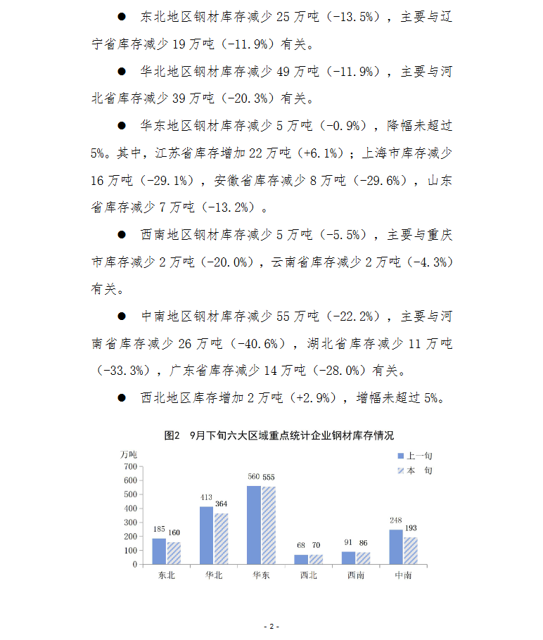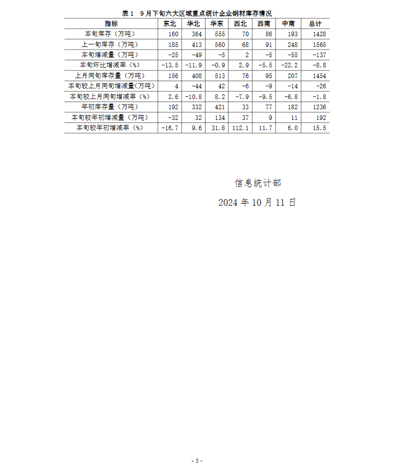2024年9月下旬,重点统计钢铁企业钢材库存量1428万吨,环比上一旬减少137万吨,下降8.8%;比年初增加192万吨,上升15.5%;比上月同旬减少26万吨,下降1.8%;比去年同旬减少97万吨,下降6.4%,比前年同旬减少160万吨,下降10.1%。
