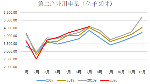 今年1-7月全社会用电量累计4.04亿千瓦时,同比下降0.7%,其中第二产业用电量同比下降2.2%,城乡居民用电量同比增长8%;7月份全社会用电量6824亿千瓦时,同比增长2.3%,其中,城乡居民用电量做出主要贡献,同比增长13.8%,第二产业用电量同比下降0.7%。1-7月第二产业用电量持续低迷主要由于年初疫情影响,全国经济生产活动停滞1个多月后启动较晚。在全社会用电量中第二产业用电量占比最大,超过65%,将直接决定全社会用电量的变化。
