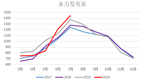 今年进入三季度后全国大范围迎来持续降雨天气,南方经历了超长梅雨季,降雨量创出历史高位水平,近期降雨北移,北方地区连续降雨降温。整体看7、8月份高温天气不及往年,降雨量明显增多,水电对火电的替代非常明显。从数据来看,今年7月火电发电量同比下降0.7%,水电发电量同比增长6.1%,预计8月份依然是水电强于火电的局面。进入9月后降水将迎来季节性回落,水电占比将会边际转弱,但依然会好于往年同期。
