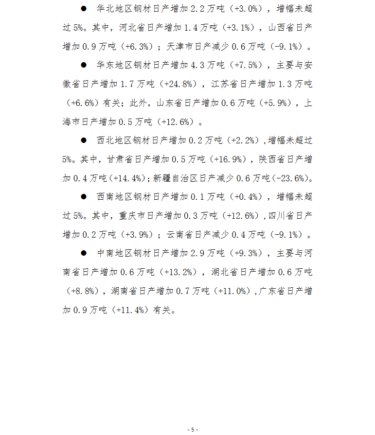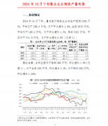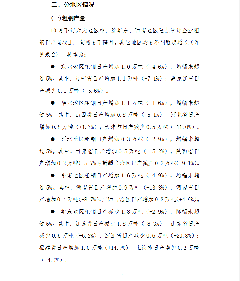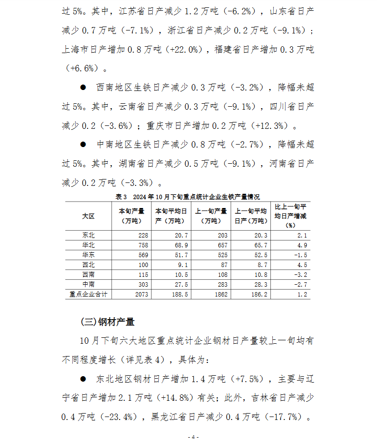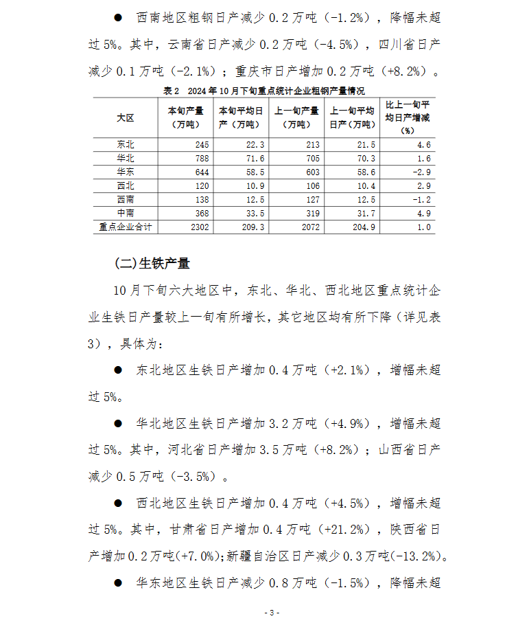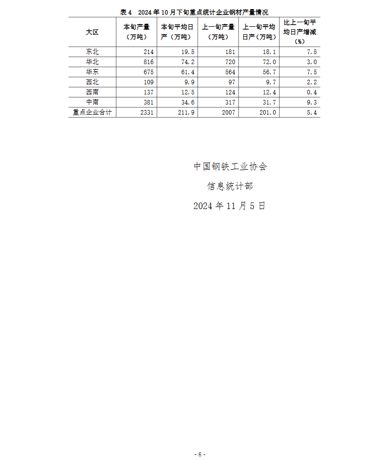 中钢协数据显示,2024年10月下旬,重点统计钢铁企业共生产粗钢2302万吨,平均日产209.3万吨,日产环比增长1.0%;生铁2073万吨,平均日产188.5万吨,日产环比增长1.2%;钢材2331万吨,平均日产211.9万吨,日产环比增长5.6%。