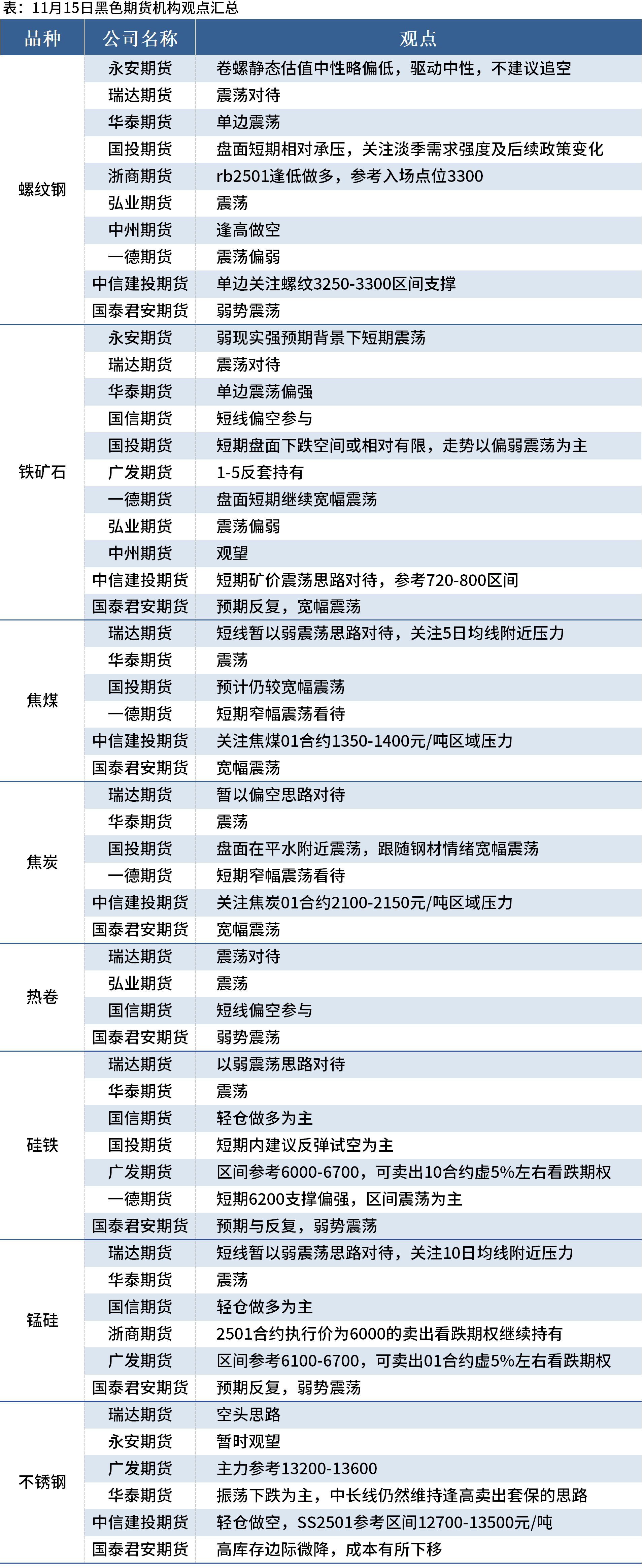 据Mysteel统计11月15日12家期货机构操作策略,其中多数机构料螺纹钢震荡运行,铁矿石震荡运行,双焦震荡运行。具体汇总内容如下: