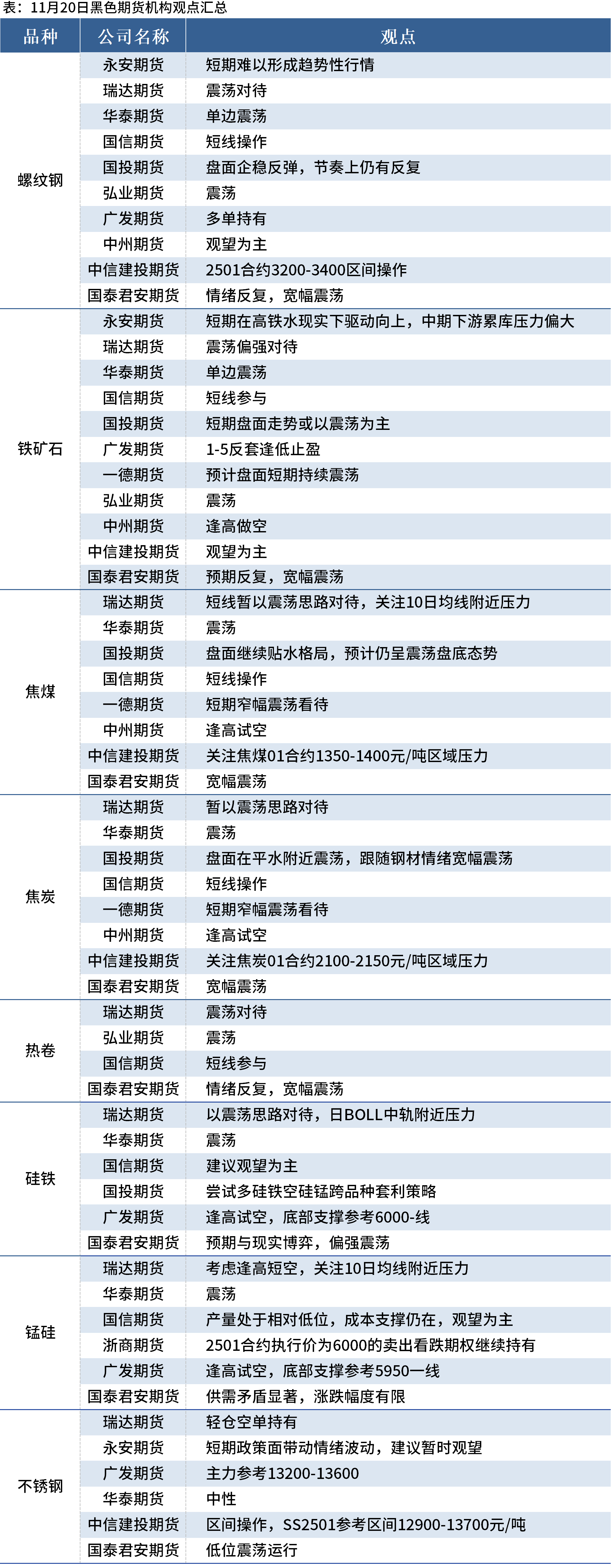 据Mysteel统计11月20日12家期货机构操作策略,其中多数机构料螺纹钢震荡运行,铁矿石震荡运行,双焦震荡运行。具体汇总内容如下: