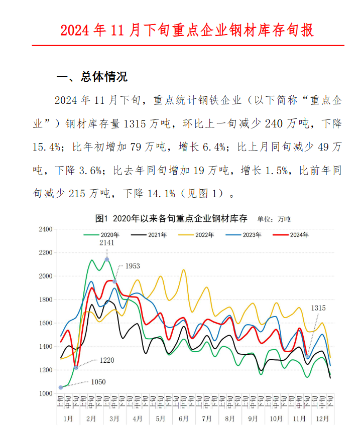 2024年11月下旬,重点统计钢铁企业钢材库存量1315万吨,环比上一旬减少240万吨,下降15.4%;比年初增加79万吨,增长6.4%;比上月同旬减少49万吨,下降3.6%;比去年同旬增加19万吨,增长1.5%,比前年同旬减少215万吨,下降14.1%。
