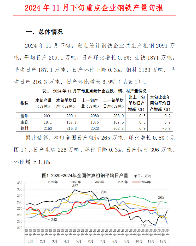 2024年11月下旬,重点统计钢铁企业共生产粗钢2091万吨,平均日产209.1万吨,日产环比增长0.5%;生铁1871万吨,平均日产187.1万吨,日产环比下降0.3%;钢材2163万吨,平均日产216.3万吨,日产环比增长6.9%。
