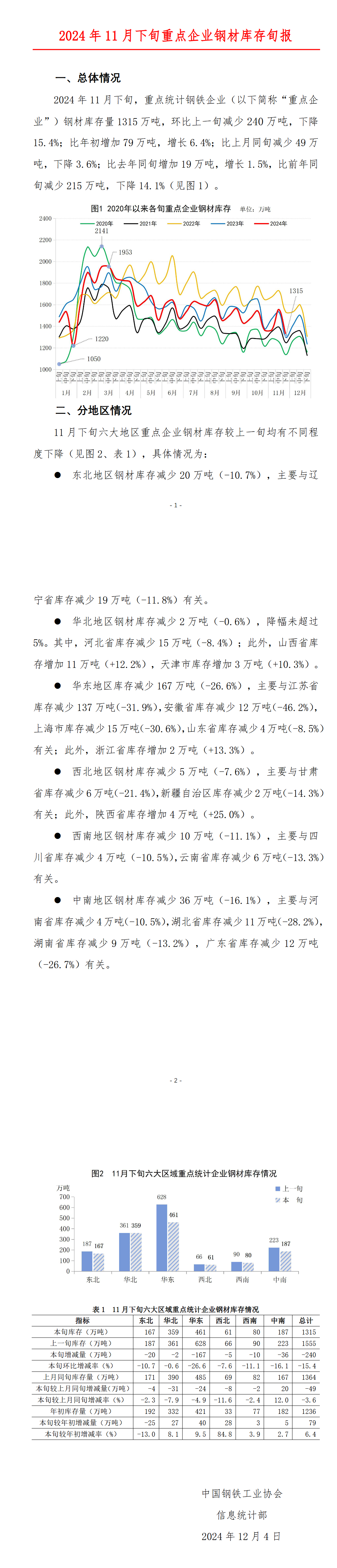 2024年11月下旬,重点统计钢铁企业钢材库存量1315万吨,环比上一旬减少240万吨,下降15.4%;比年初增加79万吨,增长6.4%;比上月同旬减少49万吨,下降3.6%;比去年同旬增加19万吨,增长1.5%,比前年同旬减少215万吨,下降14.1%。