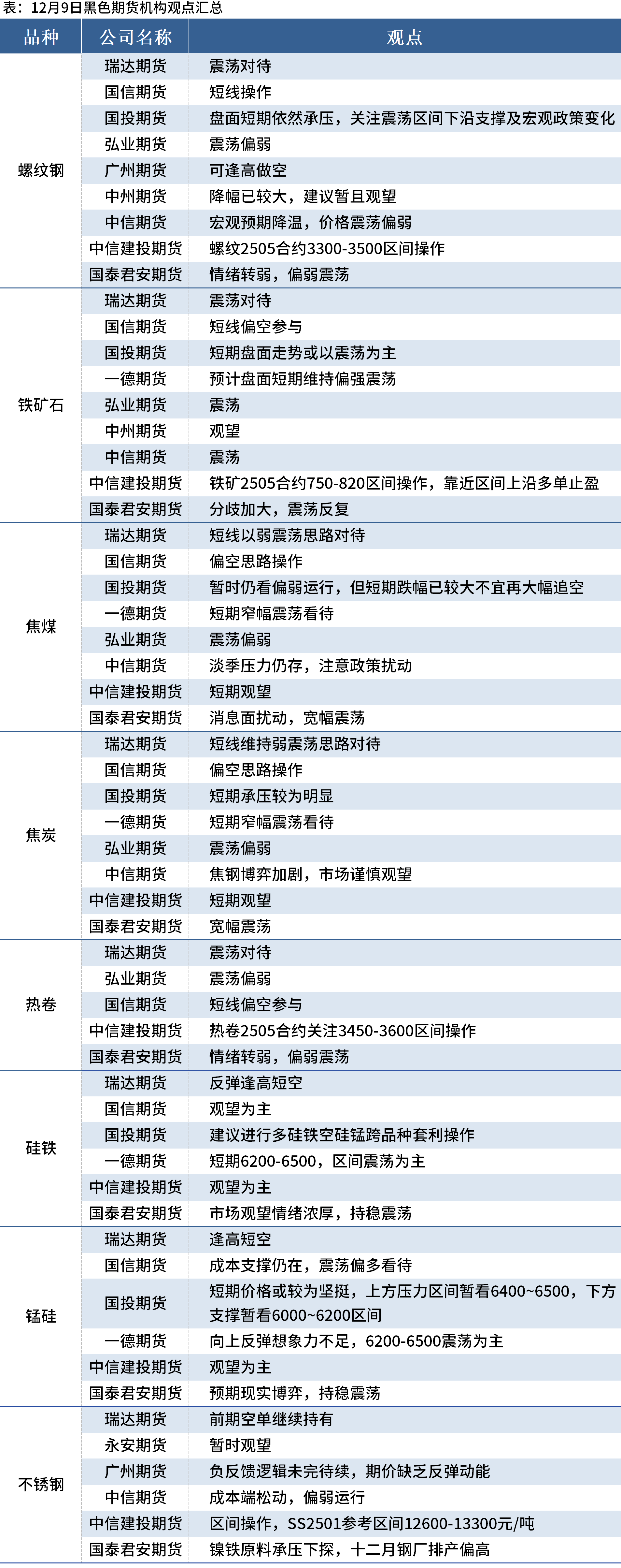 据Mysteel统计12月9日11家期货机构操作策略,其中多数机构料螺纹钢震荡运行,铁矿石震荡运行,双焦震荡运行。具体汇总内容如下:
