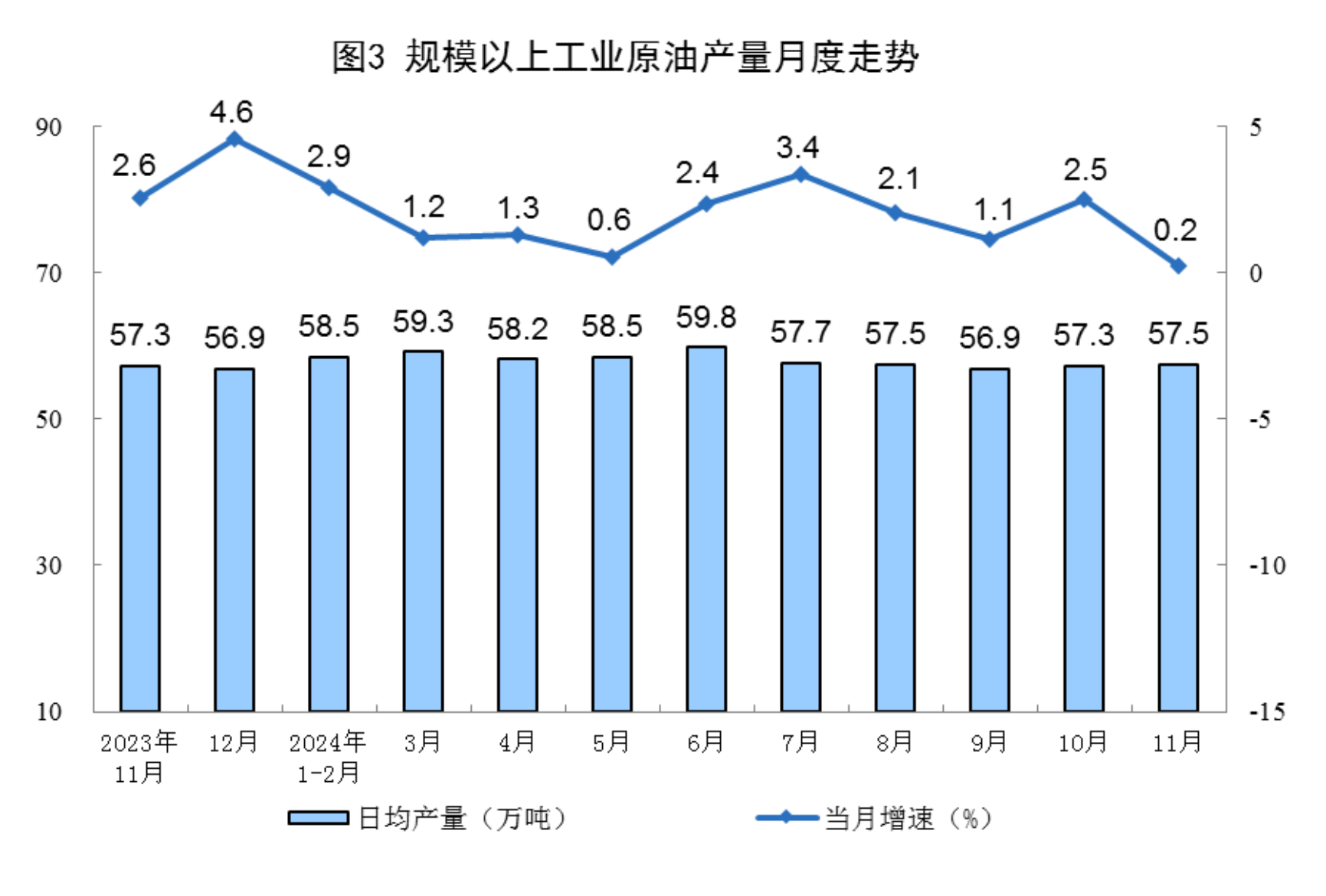 原油生产保持增长。11月份,规上工业原油产量1725万吨,同比增长0.2%;日均产量57.5万吨。进口原油4852万吨,同比增长14.4%。