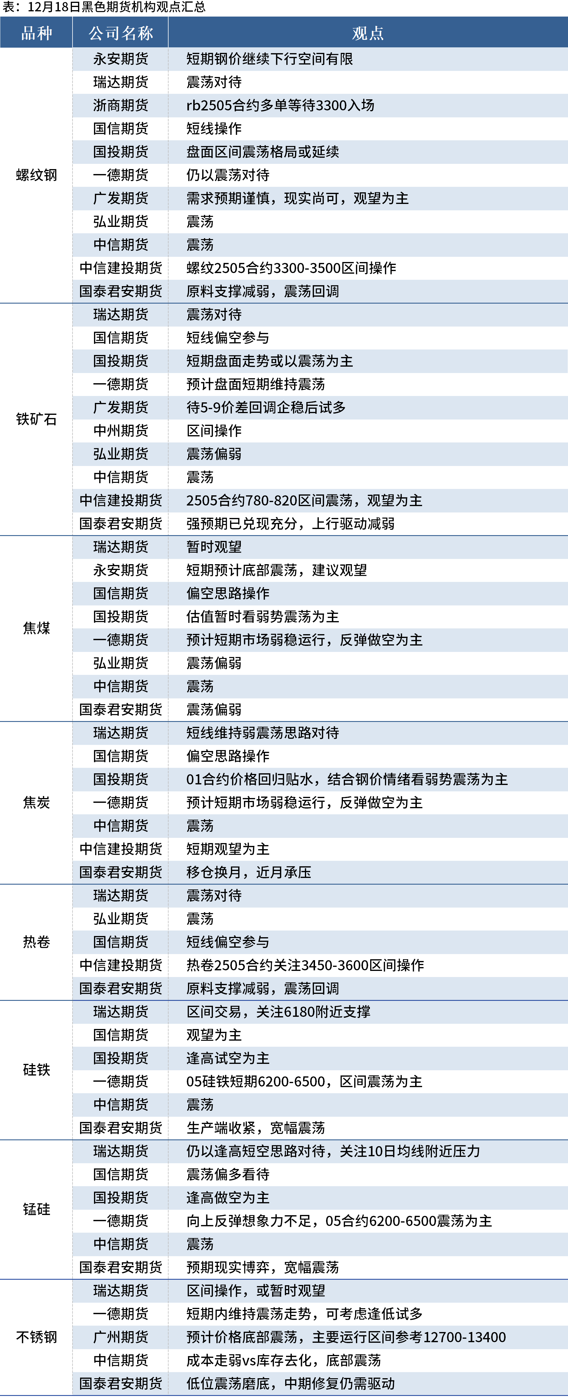 据Mysteel统计12月18日13家期货机构操作策略,其中多数机构料螺纹钢震荡运行,铁矿石震荡运行,双焦震荡运行。具体汇总内容如下:
