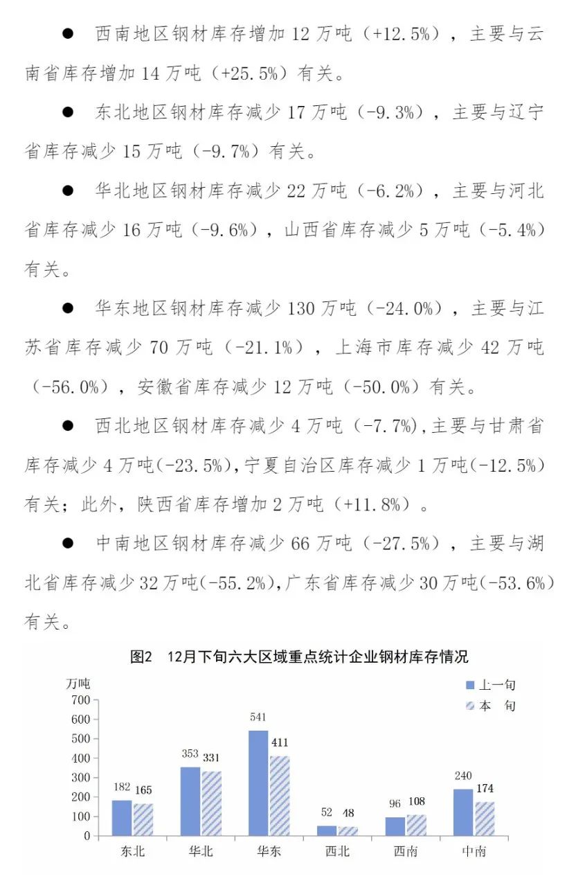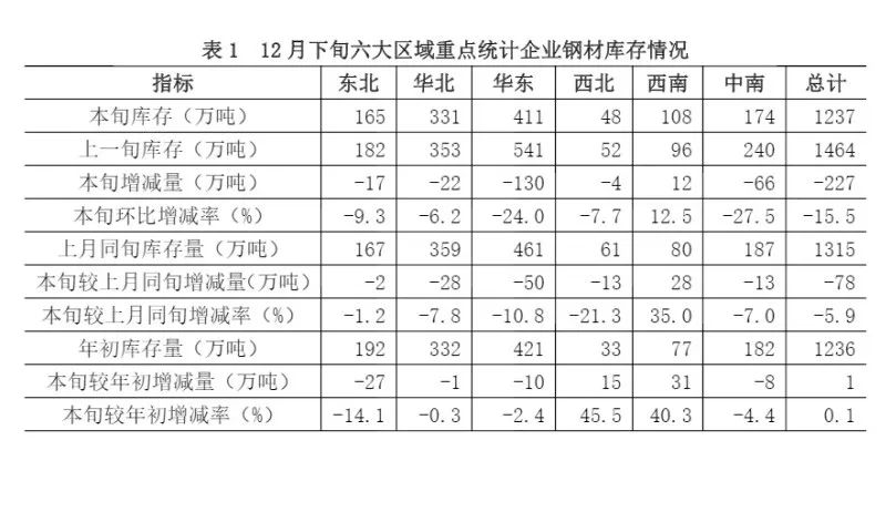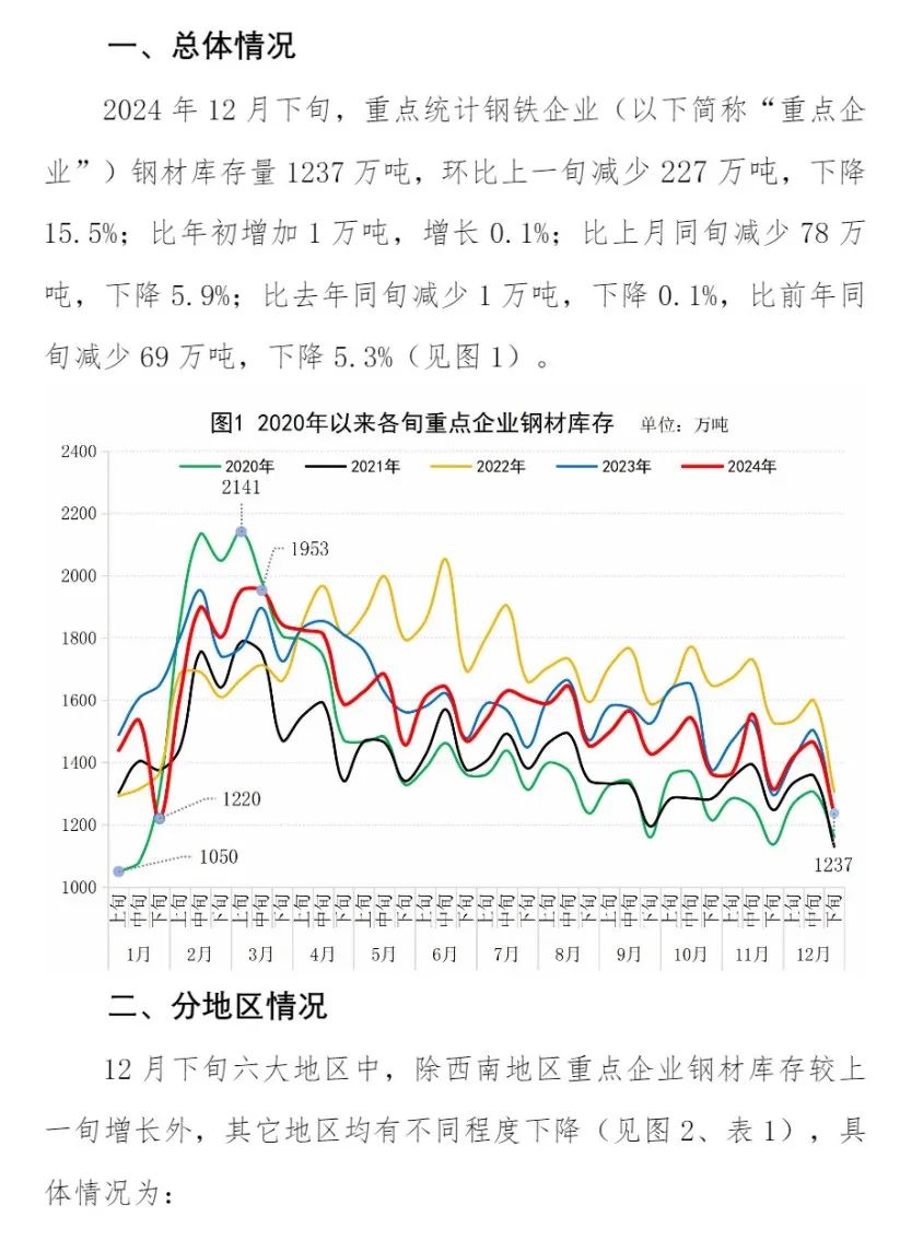 中钢协数据显示,2024年12月下旬,重点统计钢铁企业钢材库存量1237万吨,环比上一旬减少227万吨,下降15.5%;比上月同旬减少78万吨,下降5.9%。