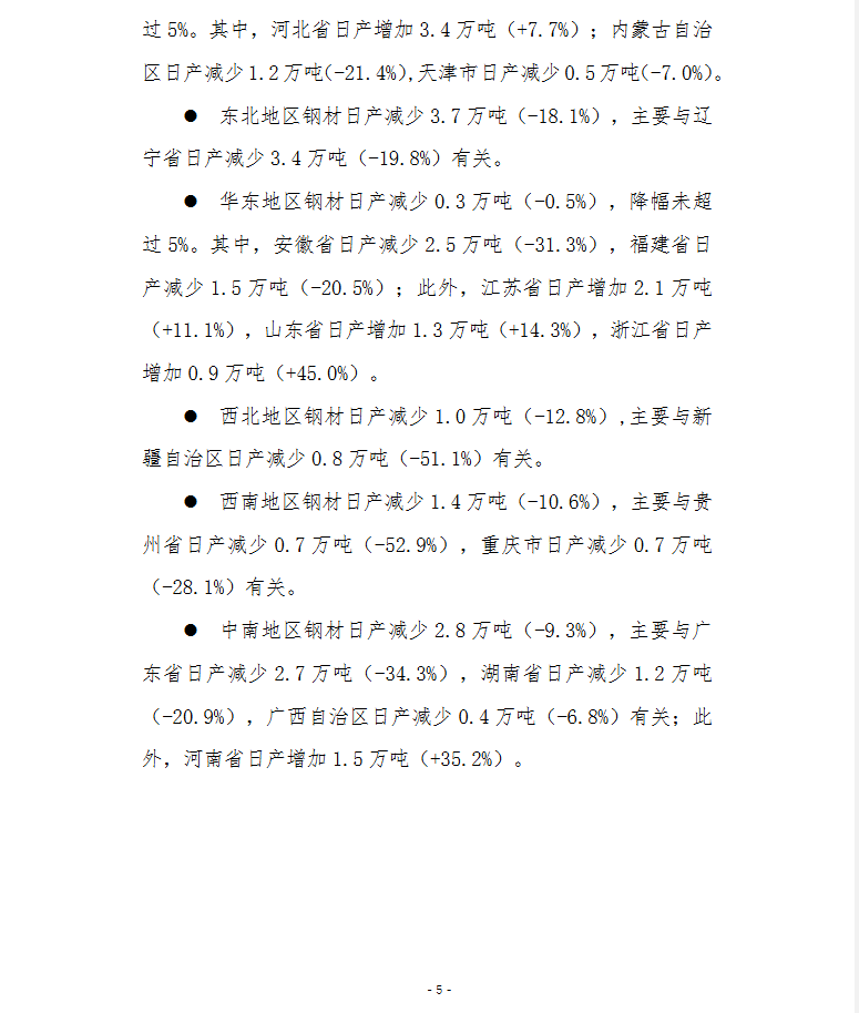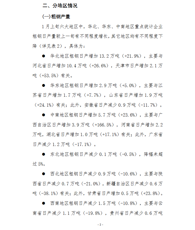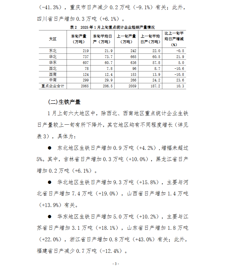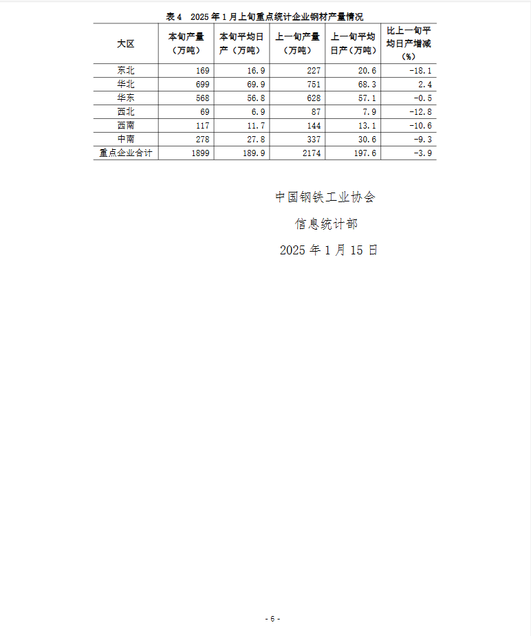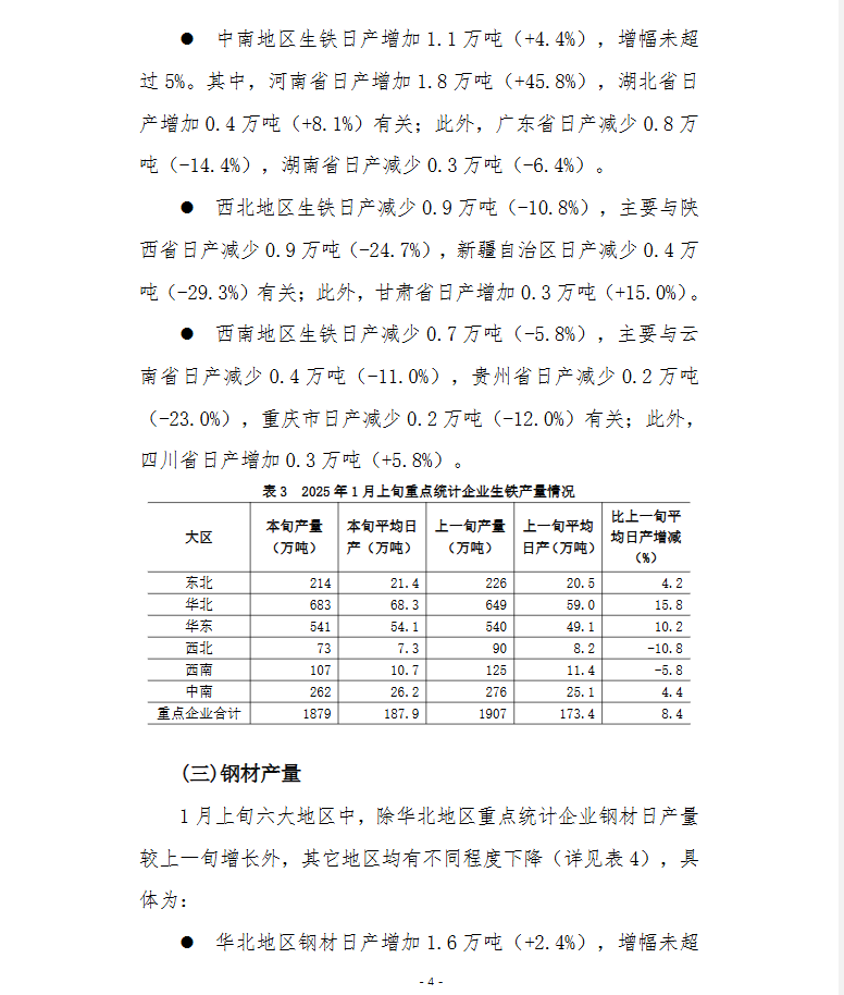中钢协数据显示,2025 年1月上旬,重点统计钢铁企业共生产粗钢2065万吨,平均日产206.5万吨,日产环比增长10.3%;生铁1879万吨,平均日产187.9 万吨,日产环比增长8.49%;钢材1899万吨,平均日产189.9万吨,日产环比下降3.9%。