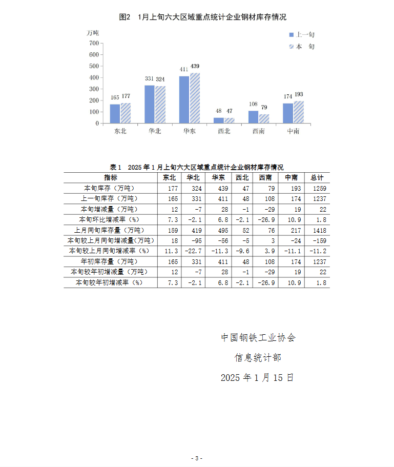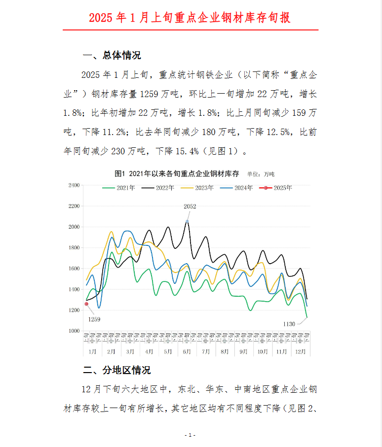 中钢协数据显示,2025 年1月上旬,重点统计钢铁企业钢材库存量1259万吨,环比上一旬增加22万吨,增长1.8%;比年初增加22万吨,增长1.8%;比上月同旬减少159 万吨,下降11.2%;比去年同旬减少180万吨,下降12.5%,比前年同旬减少230万吨,下降15.4%。