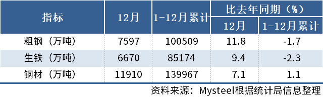 1-12月,中国粗钢产量100509万吨,同比下降1.7%;生铁产量85174万吨,同比下降2.3%;钢材产量139967万吨,同比增长1.1%。