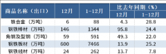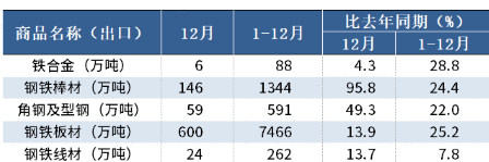 12月,中国出口钢铁棒材146万吨,同比增长95.8%;1-12月累计出口1344万吨,同比增长24.4%。