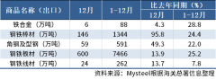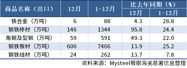 12月,中国出口钢铁棒材146万吨,同比增长95.8%;1-12月累计出口1344万吨,同比增长24.4%。其他出口情况如下表所示:
