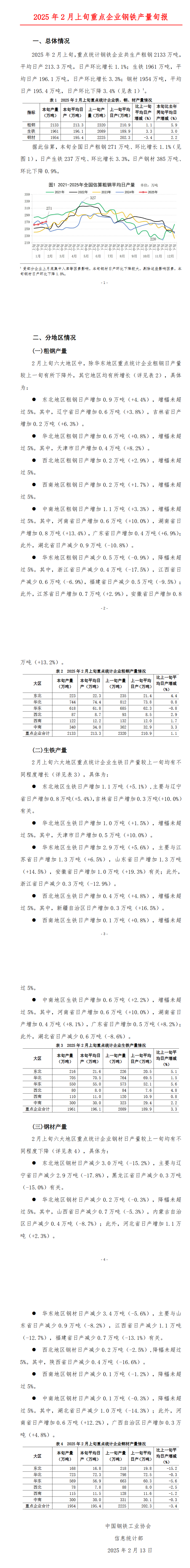 2025年2月上旬,重点统计钢铁企业共生产粗钢2133万吨,平均日产213.3万吨,日产环比增长1.1%;生铁1961万吨,平均日产196.1万吨,日产环比增长3.3%;钢材1954万吨,平均日产195.4万吨,日产环比下降3.4%。
