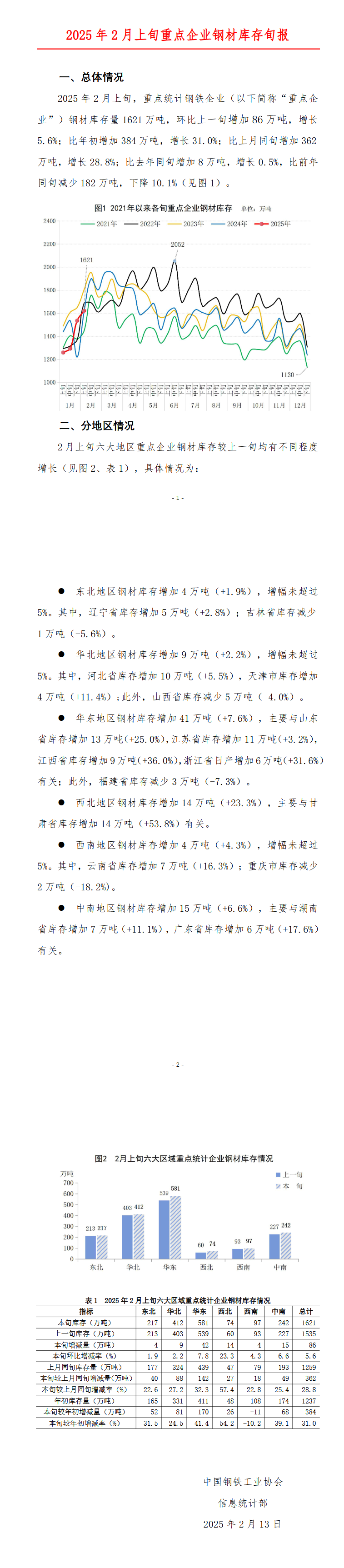 2025年2月上旬,重点统计钢铁企业(以下简称“重点企业”)钢材库存量1621万吨,环比上一旬增加86万吨,增长5.6%;比年初增加384万吨,增长31.0%;比上月同旬增加362万吨,增长28.8%;比去年同旬增加8万吨,增长0.5%,比前年同旬减少182万吨,下降10.1%。
