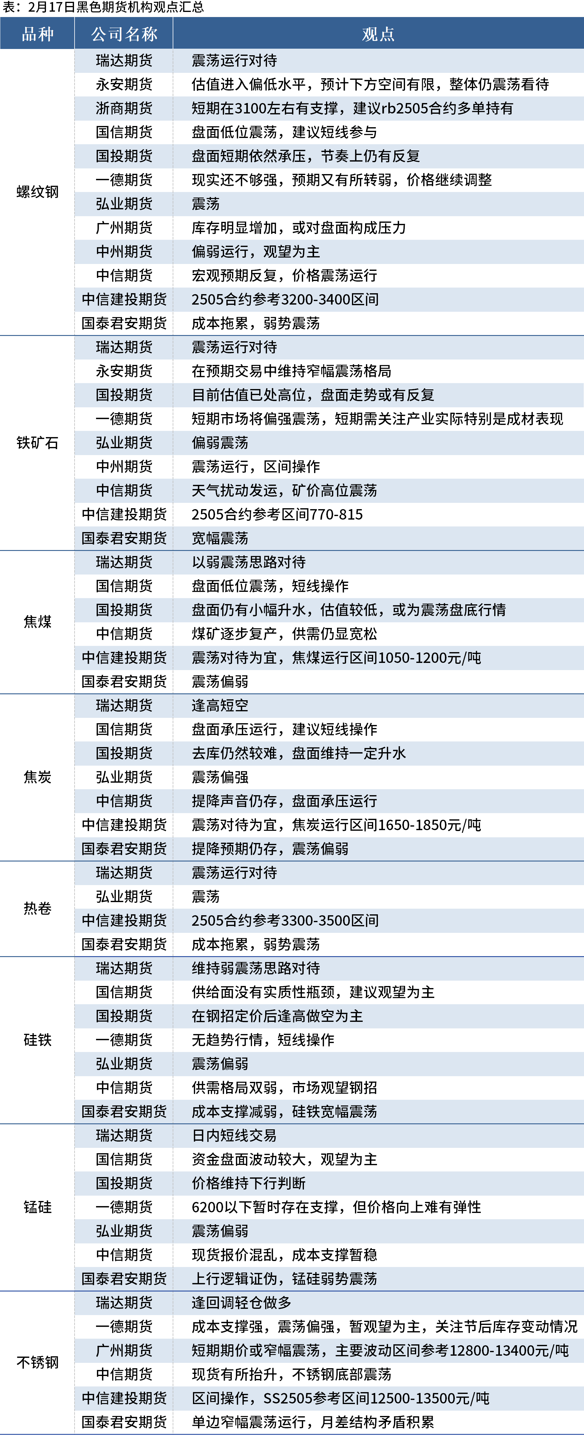 据Mysteel统计2月17日12家期货机构操作策略,其中多数机构料螺纹钢震荡运行,铁矿石震荡运行,双焦震荡运行。具体汇总内容如下: