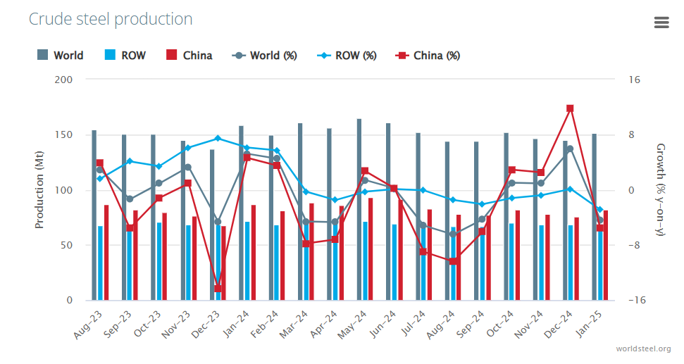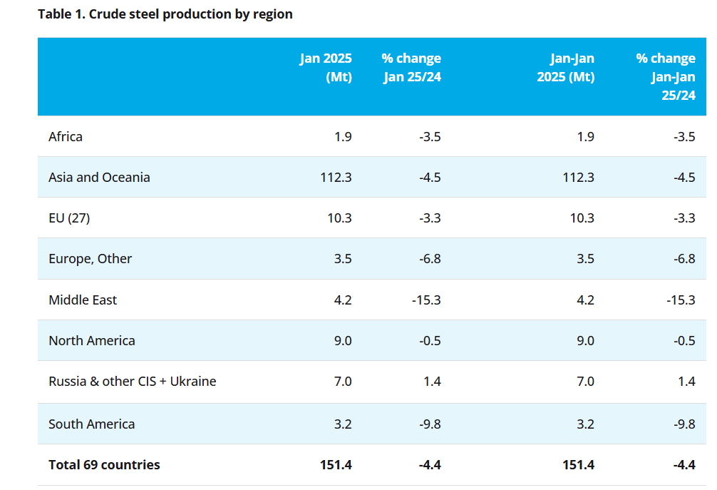 据世界钢铁协会,2025年1月全球粗钢产量为1.514亿吨,同比下降4.4%。