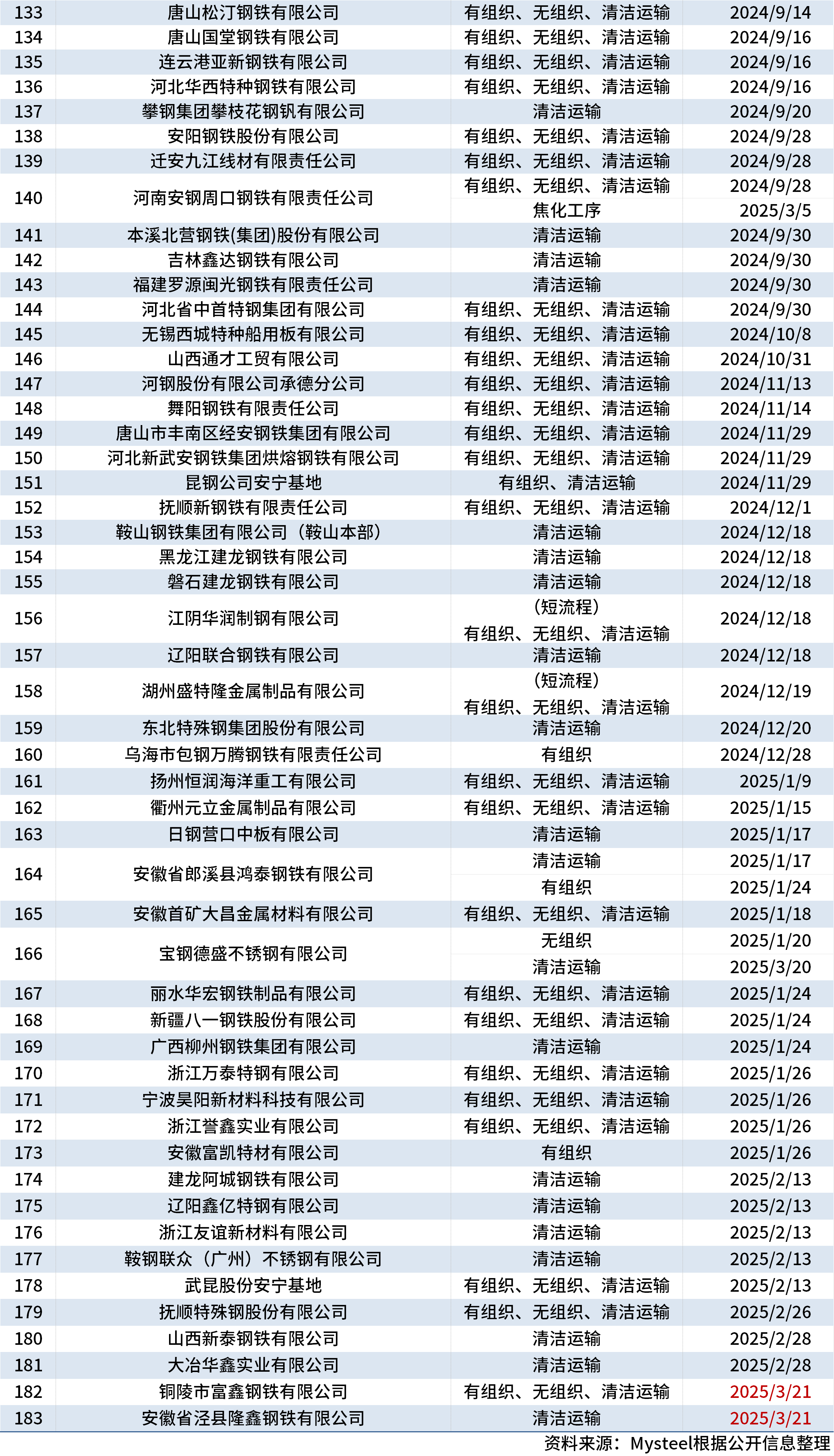 据中钢协网站消息,3月21日,有2家钢企进行超低排放改造和评估监测进展情况公示,为铜陵市富鑫钢铁有限公司和安徽省泾县隆鑫钢铁有限公司。截至目前,已有183家钢铁企业在中钢协网站进行公示。