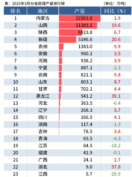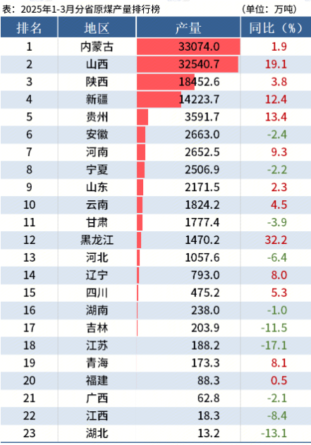 从分省数据来看,1-3月内蒙古、山西和陕西原煤产量累计同比分别增长1.9%、19.1%和3.8%。