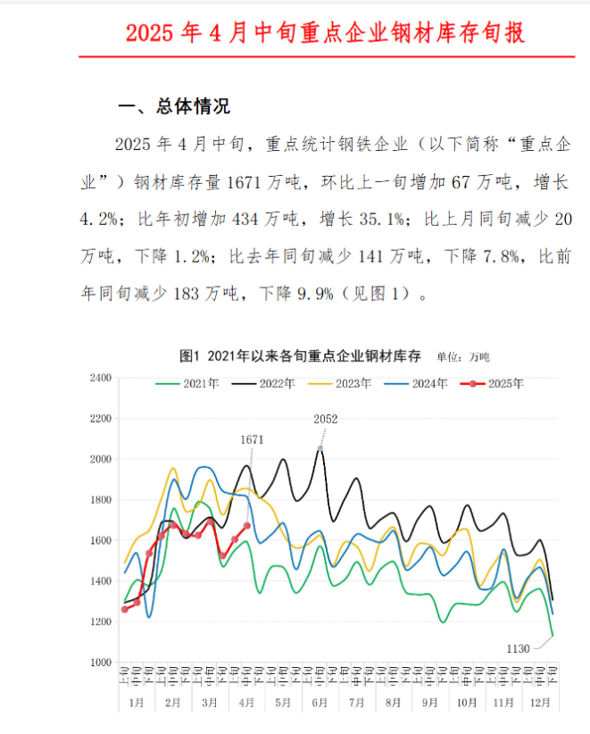 2025年4月中旬重点钢铁企业钢材库存量为1671万吨,旬环比增加67万吨,上升4.2%;比上月同旬减少20万吨,下降1.2%;比去年同旬减少141万吨,下降7.8%。